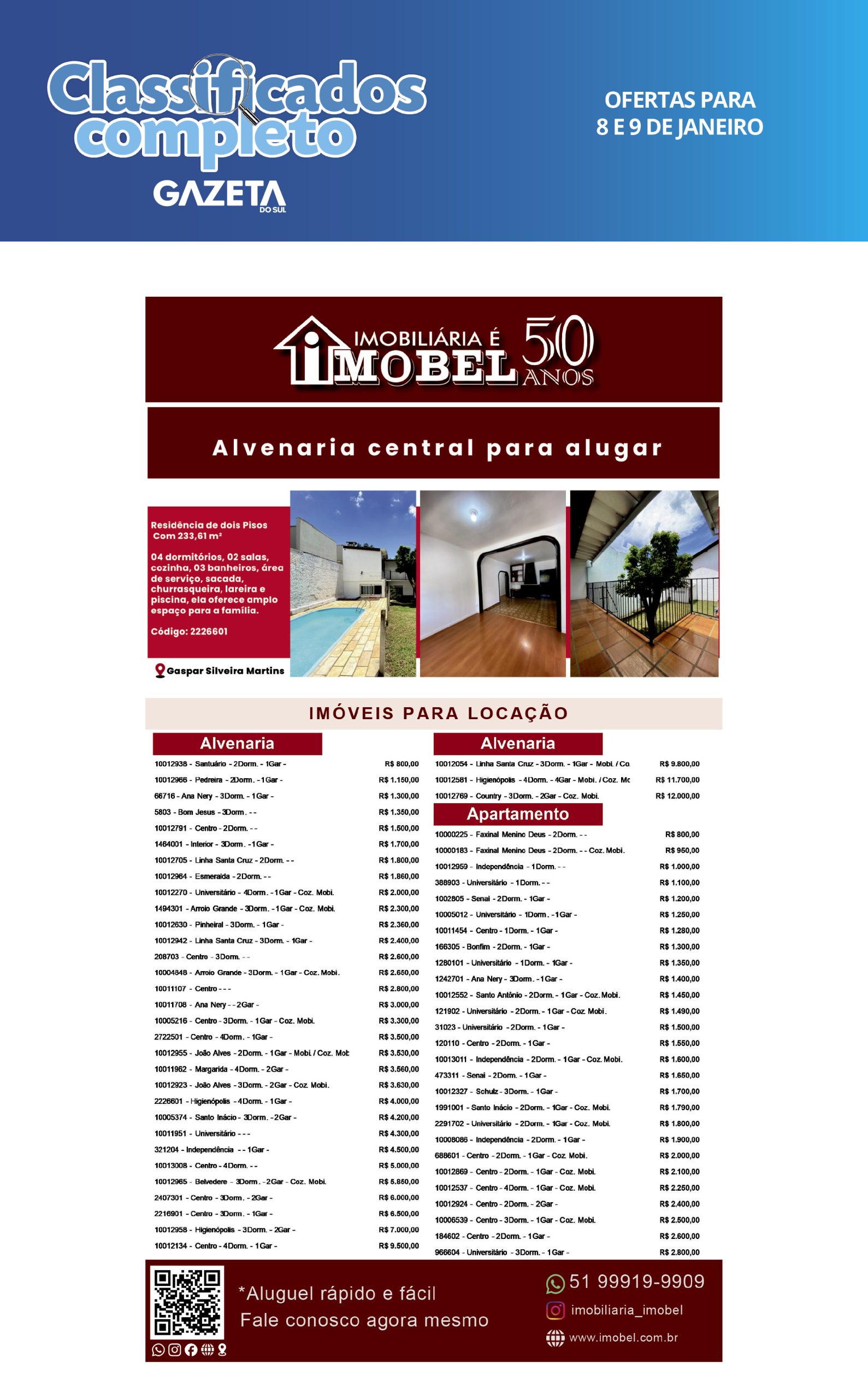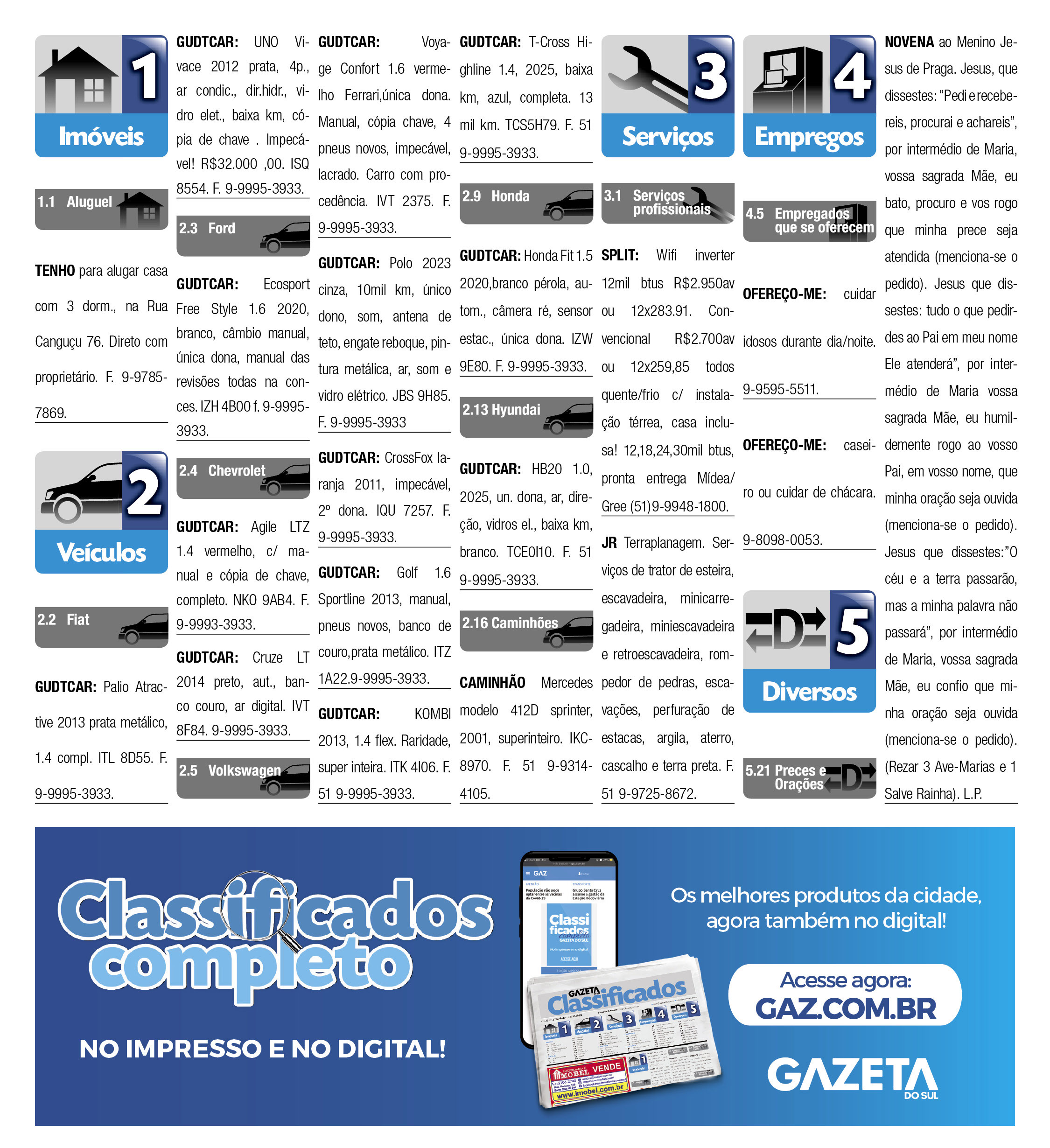 O suplemento de Classificados, que circula nas edições de terças, quintas e sábados, é um dos mais tradicionais da Gazeta do Sul, como vitrine e canal de negócios, de oferta, compra e venda em toda a região central do Rio Grande do Sul. E, para enriquecer pesquisas de produtos e serviços e possibilitar resultado ainda melhor a usuários e parceiros, nos anúncios de clientes cadastrados, o leitor tem acesso direto com link ao site do anunciante, onde poderá verificar mais detalhes sobre os itens. Confira as ofertas: