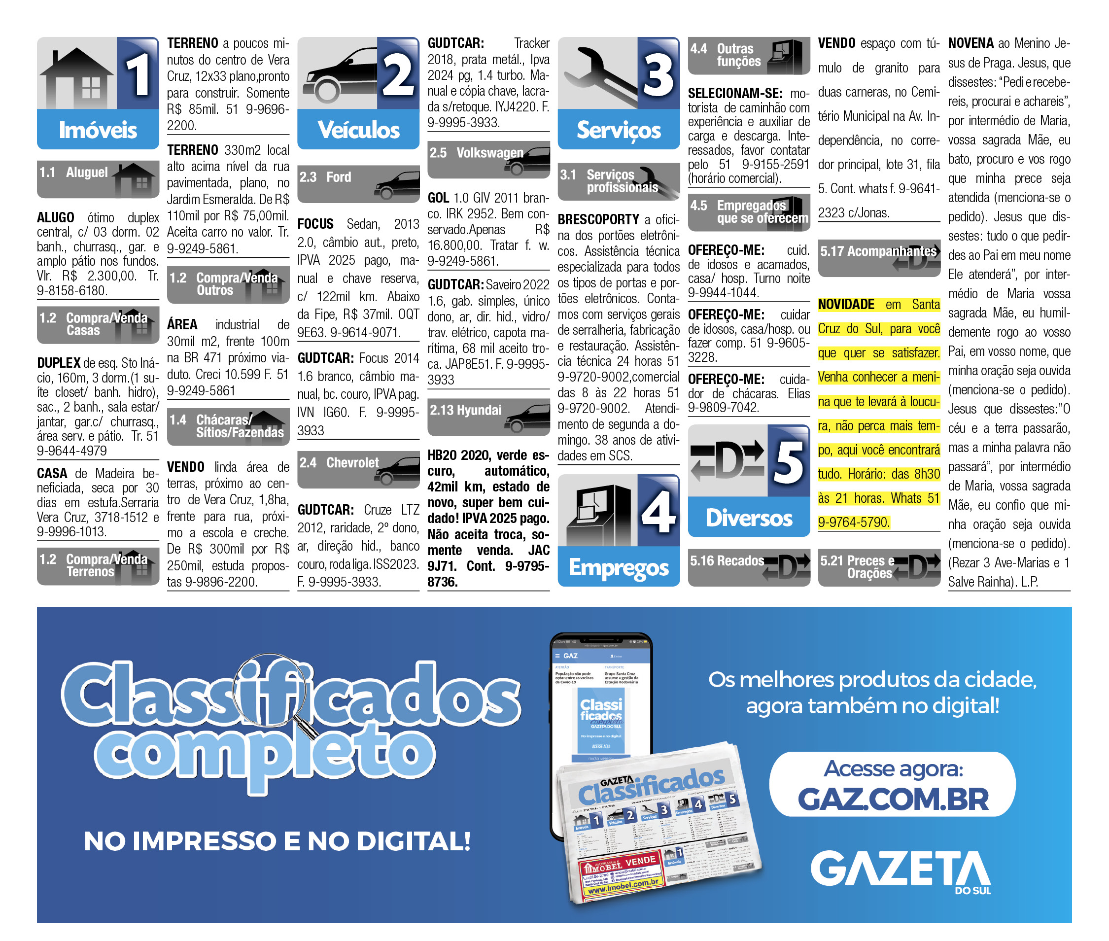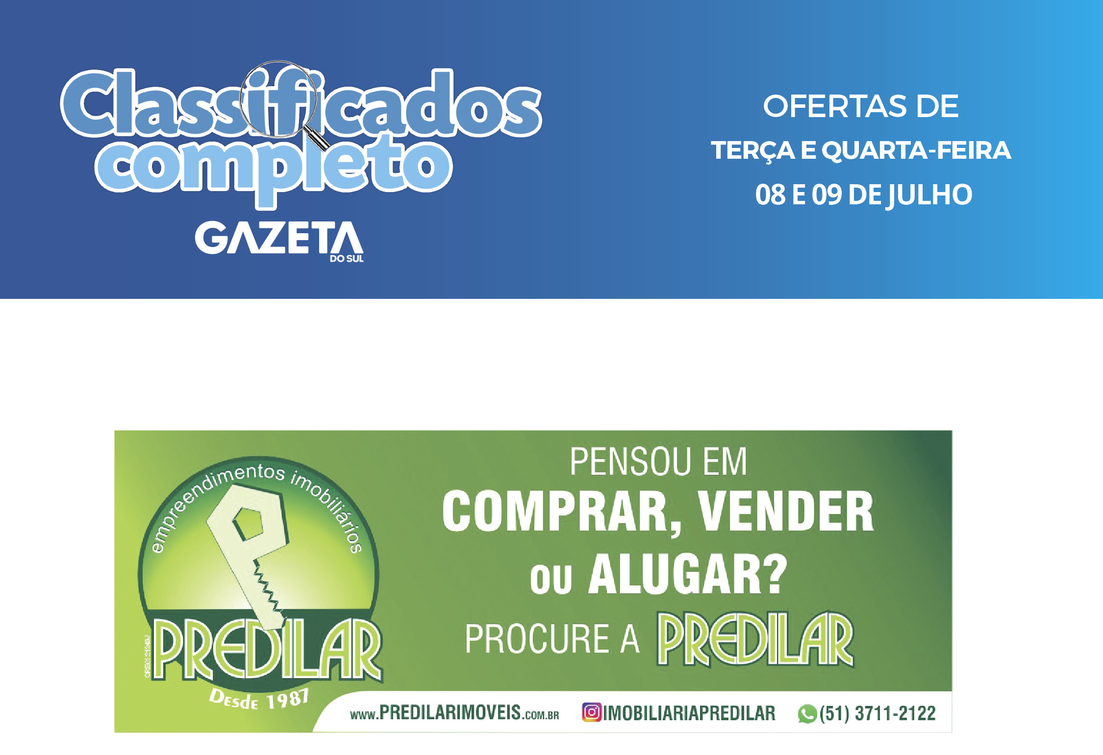 O suplemento de Classificados, que circula nas edições de terças, quintas e sábados, é um dos mais tradicionais da Gazeta do Sul, como vitrine e canal de negócios, de oferta, compra e venda em toda a região central do Rio Grande do Sul. E, para enriquecer pesquisas de produtos e serviços e possibilitar resultado ainda melhor a usuários e parceiros, nos anúncios de clientes cadastrados, o leitor tem acesso direto com link ao site do anunciante, onde poderá verificar mais detalhes sobre os itens. Confira as ofertas: