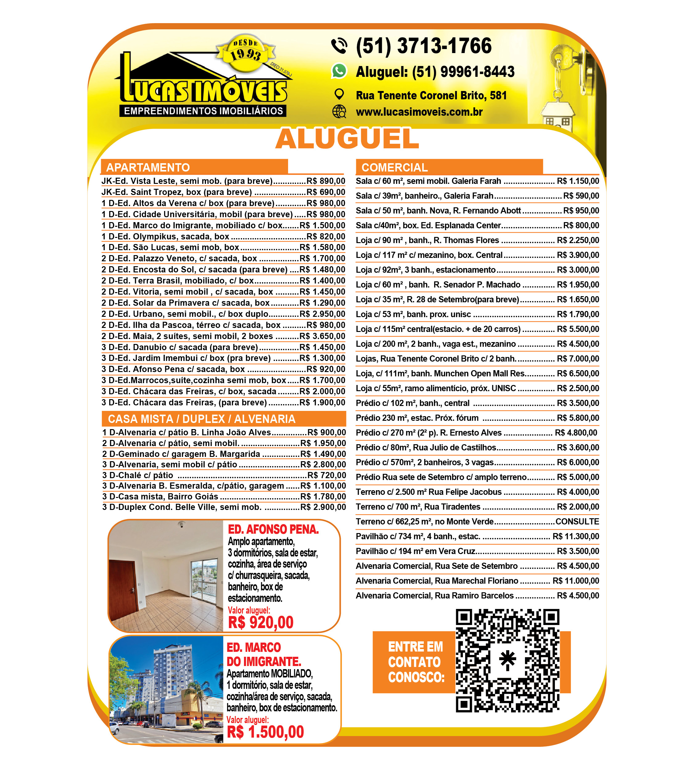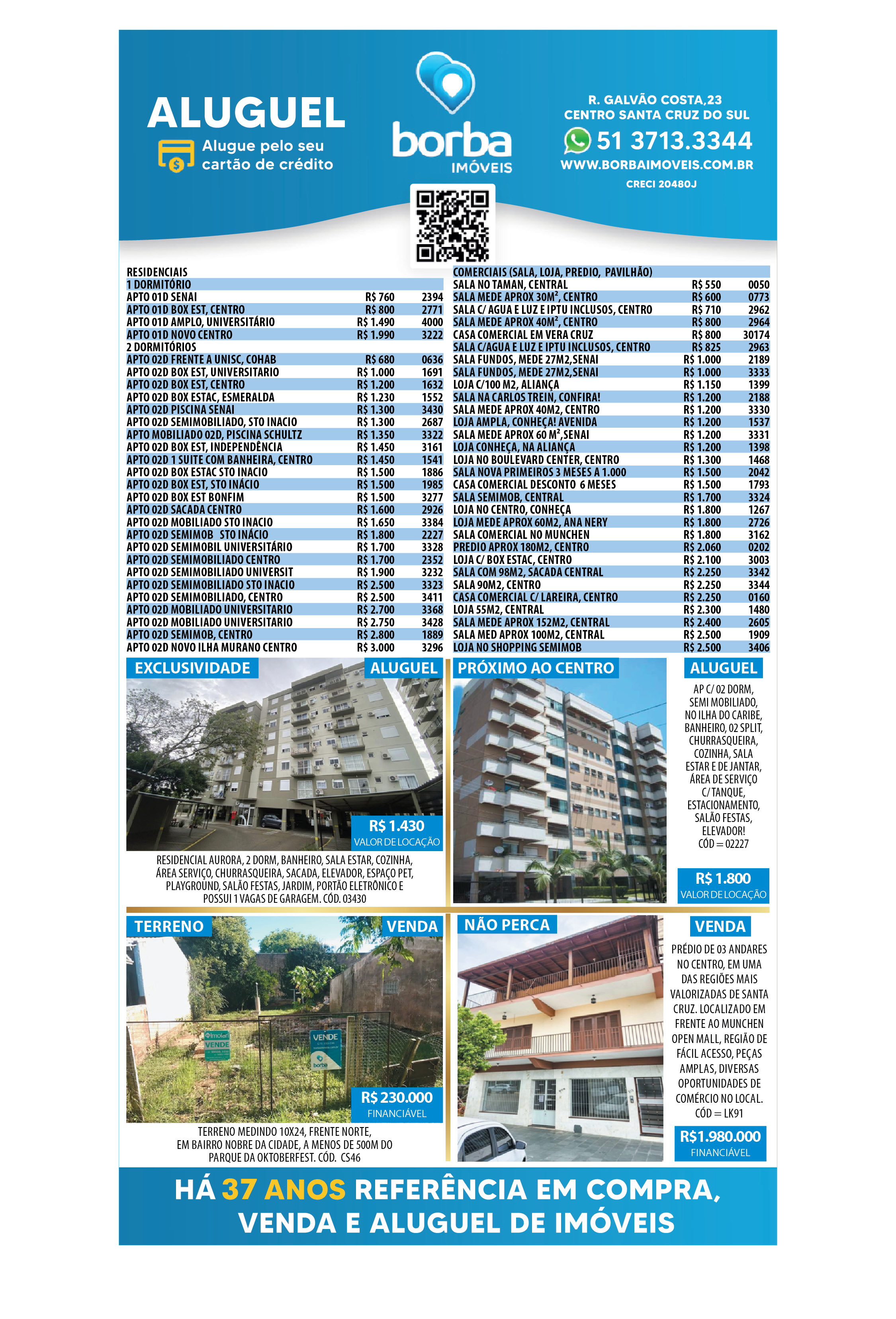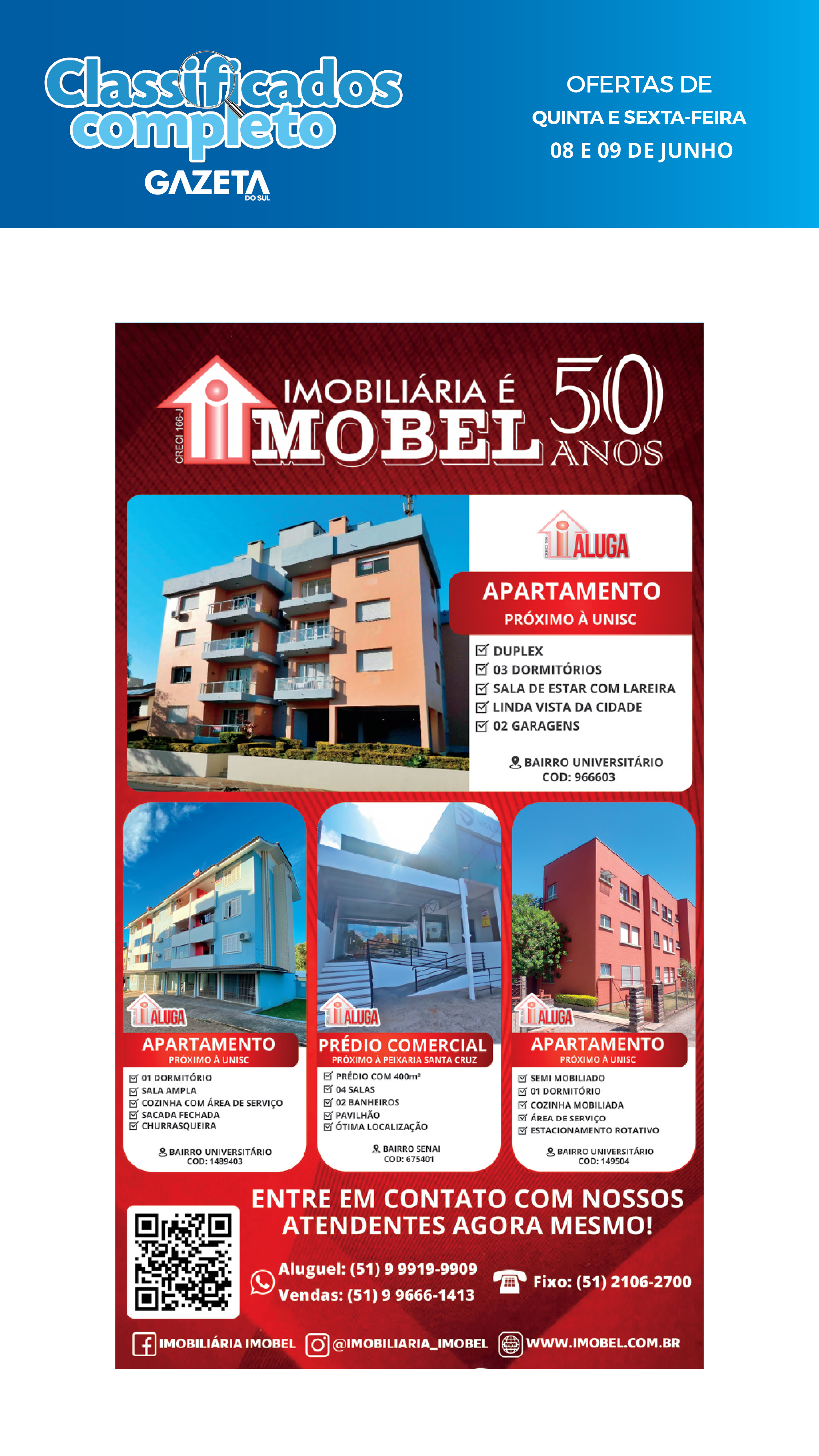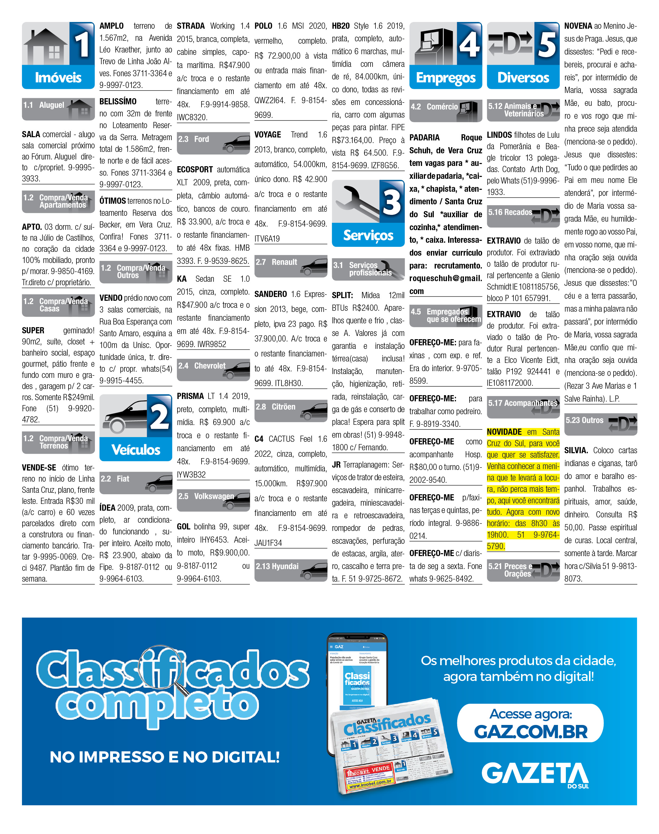 O suplemento de Classificados, que circula nas edições de terças, quintas e sábados, é um dos mais tradicionais da Gazeta do Sul, como vitrine e canal de negócios, de oferta, compra e venda em toda a região central do Rio Grande do Sul. E, para enriquecer pesquisas de produtos e serviços e possibilitar resultado ainda melhor a usuários e parceiros, nos anúncios de clientes cadastrados, o leitor tem acesso direto com link ao site do anunciante, onde poderá verificar mais detalhes sobre os itens. Confira as ofertas: