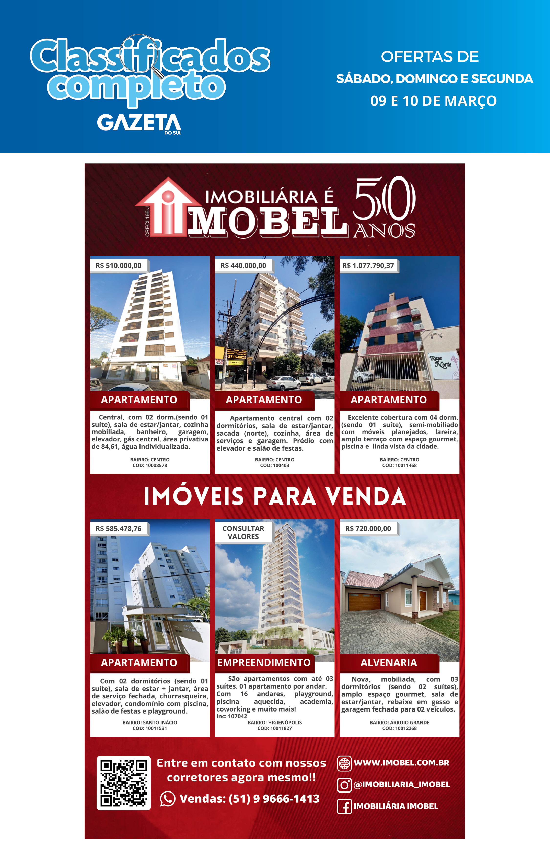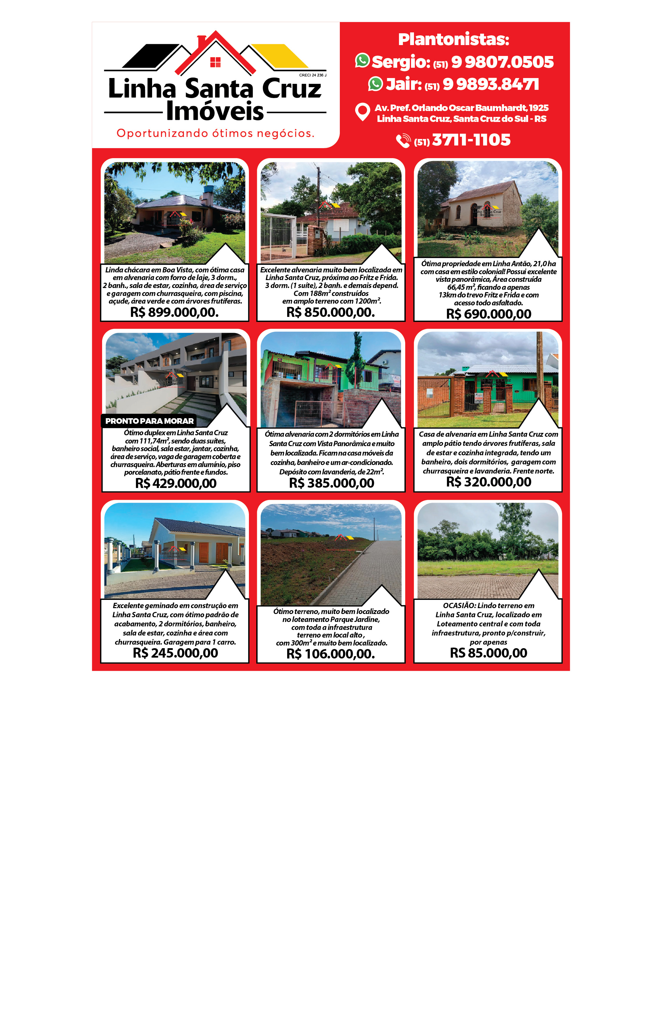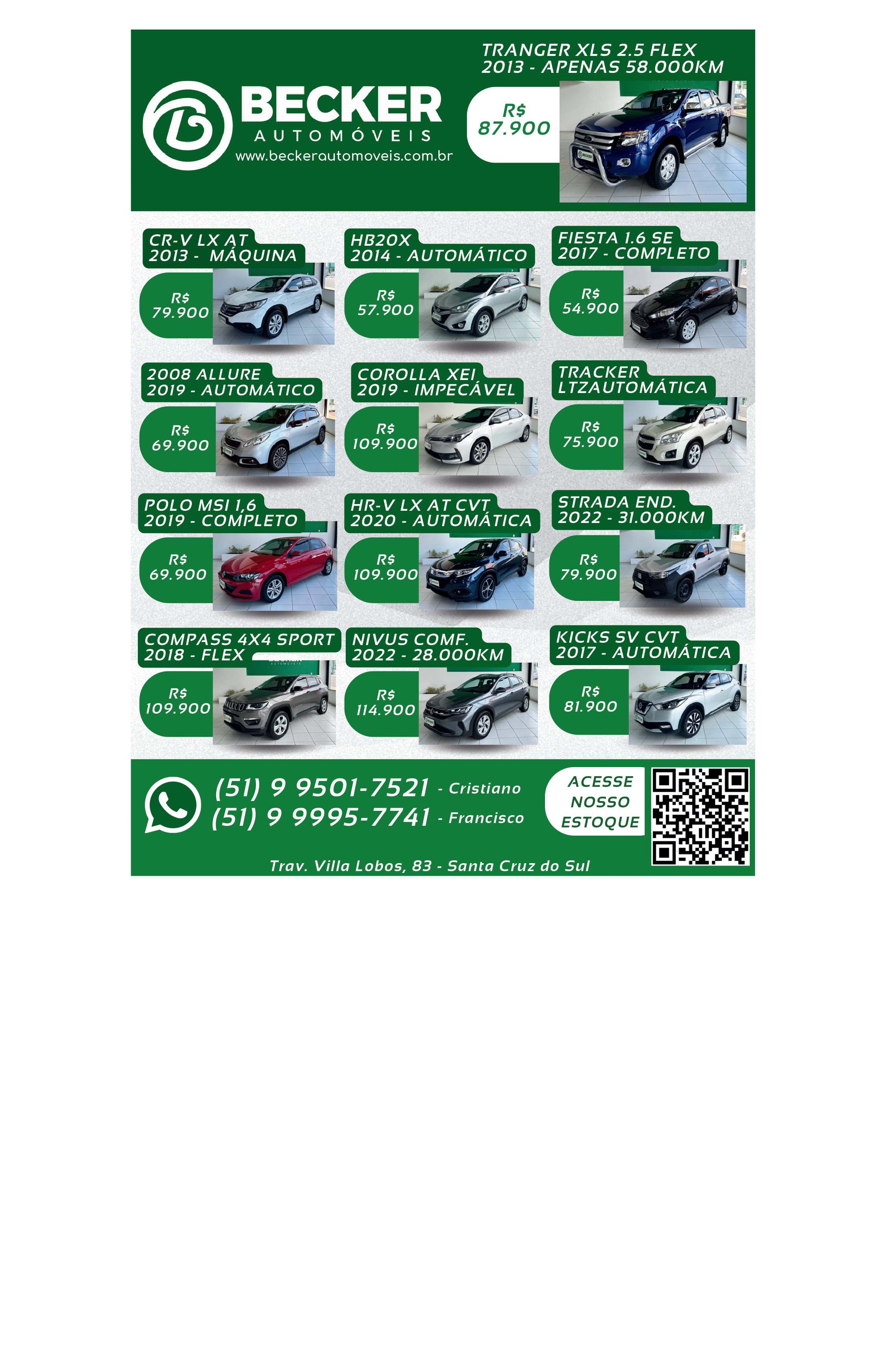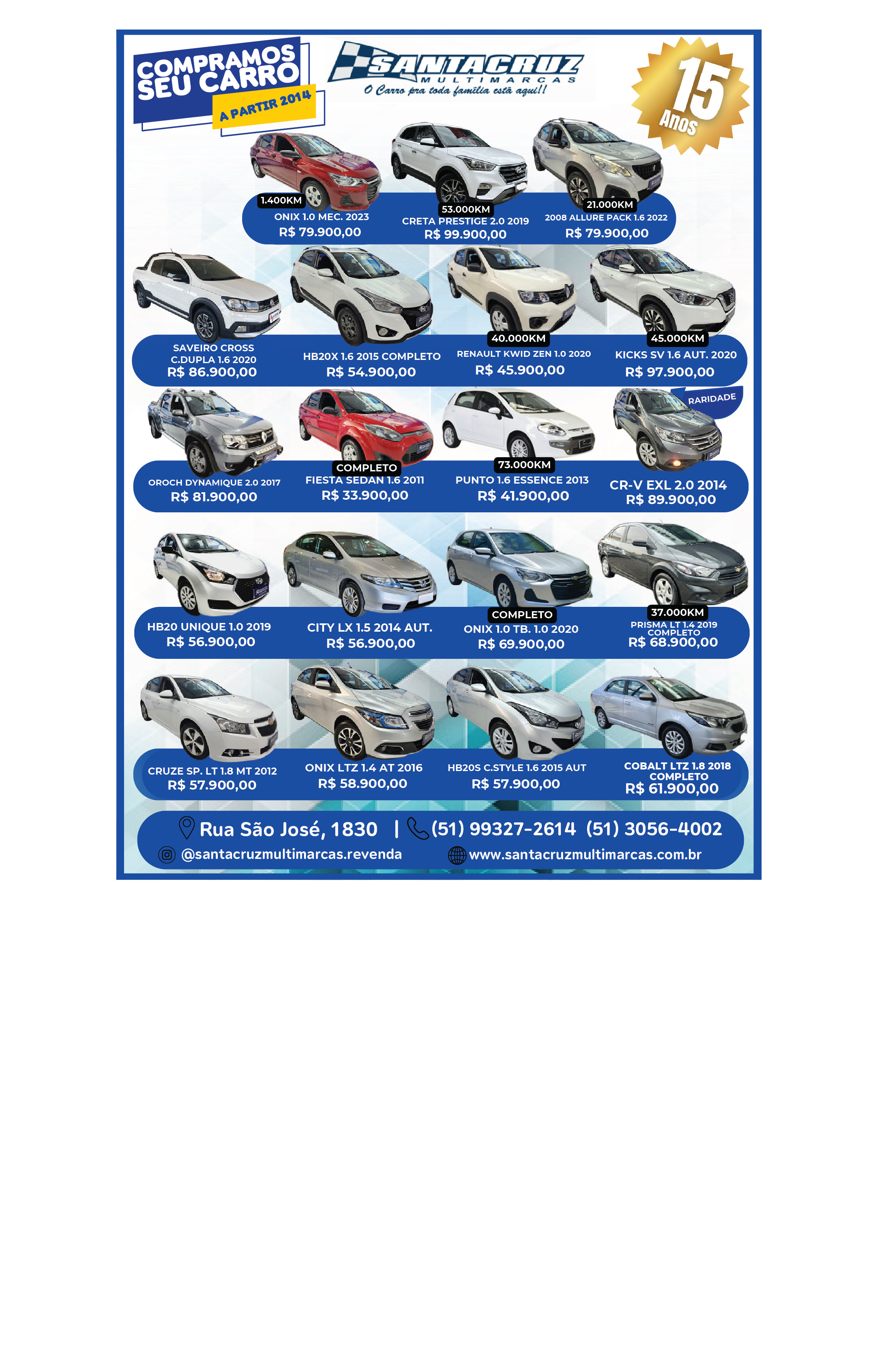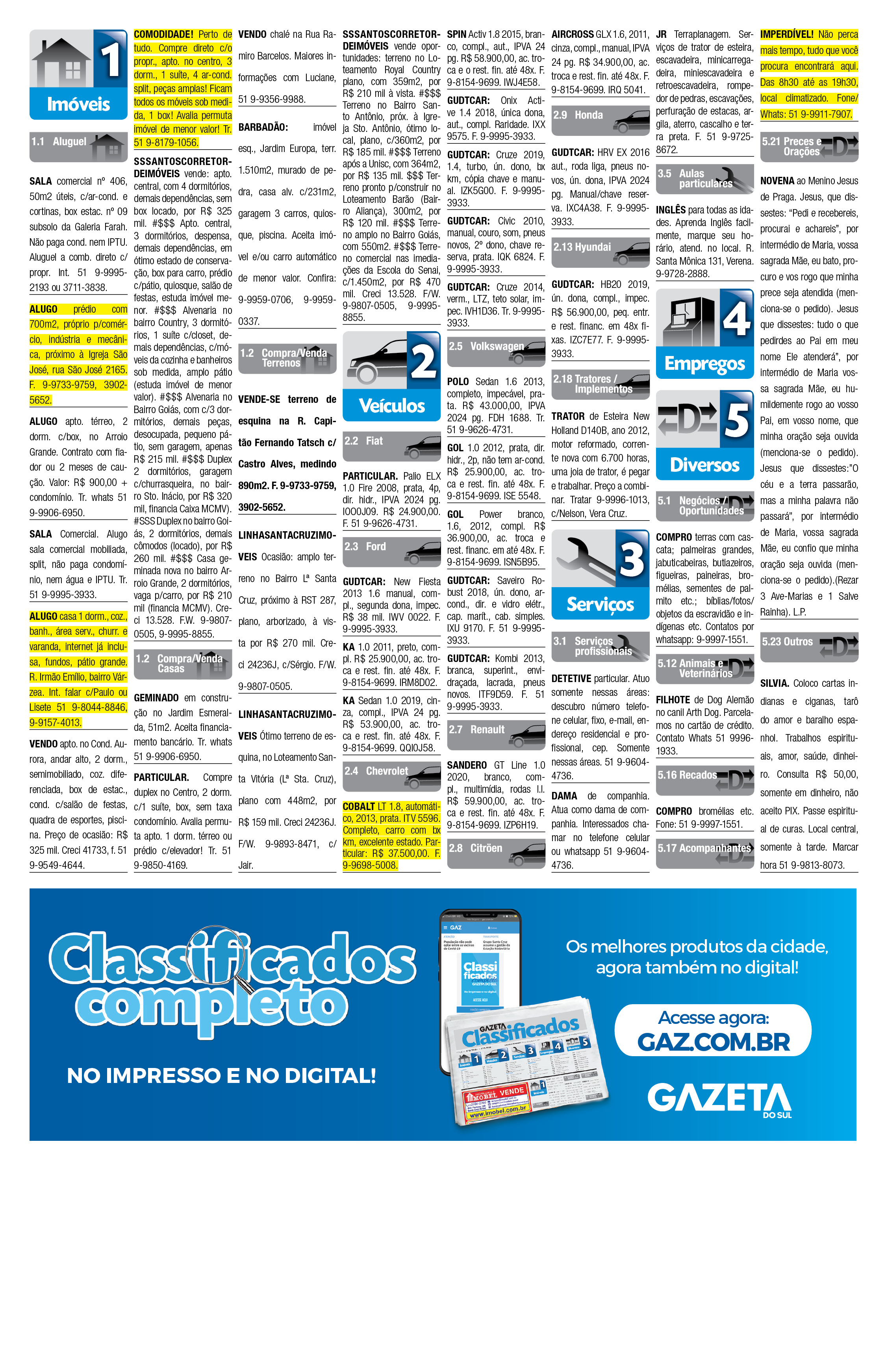 O suplemento de Classificados, que circula nas edições de terças, quintas e sábados, é um dos mais tradicionais da Gazeta do Sul, como vitrine e canal de negócios, de oferta, compra e venda em toda a região central do Rio Grande do Sul. E, para enriquecer pesquisas de produtos e serviços e possibilitar resultado ainda melhor a usuários e parceiros, nos anúncios de clientes cadastrados, o leitor tem acesso direto com link ao site do anunciante, onde poderá verificar mais detalhes sobre os itens. Confira as ofertas: