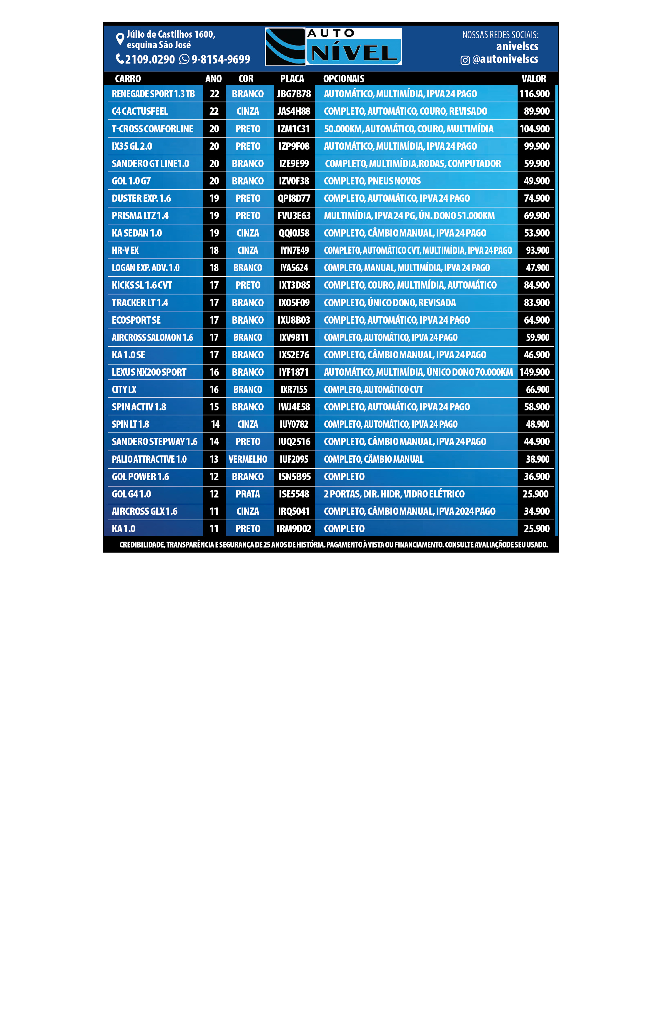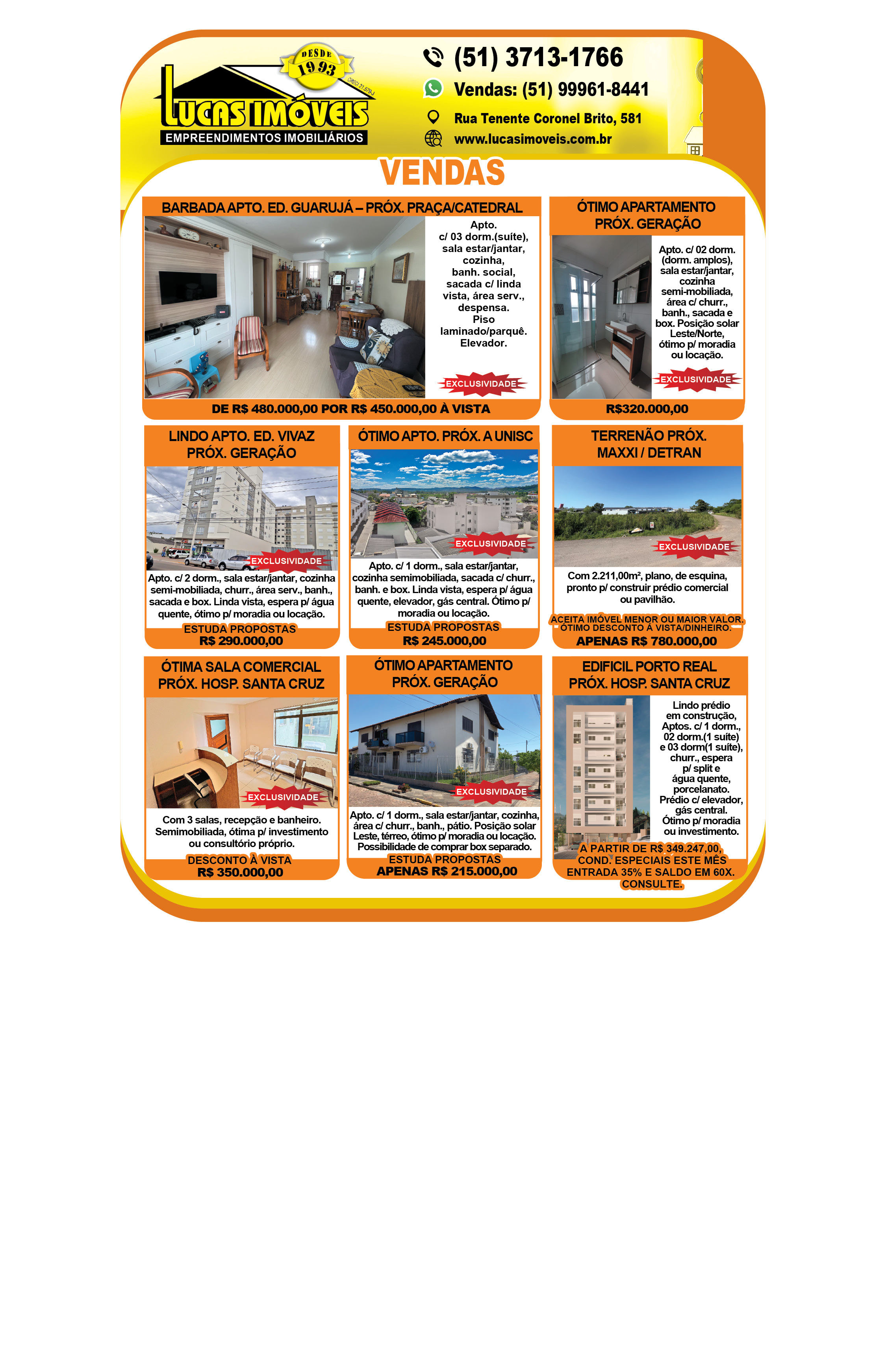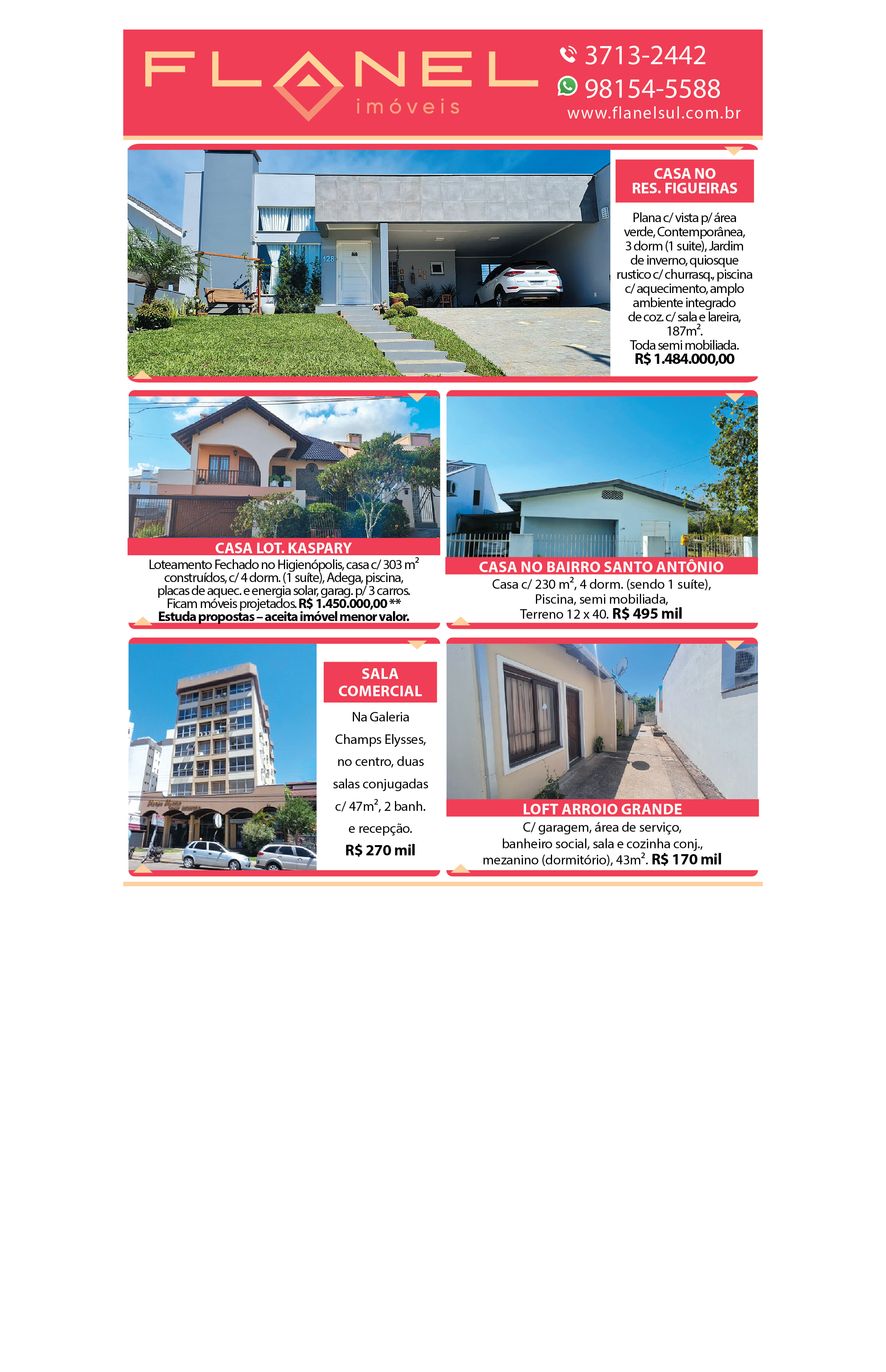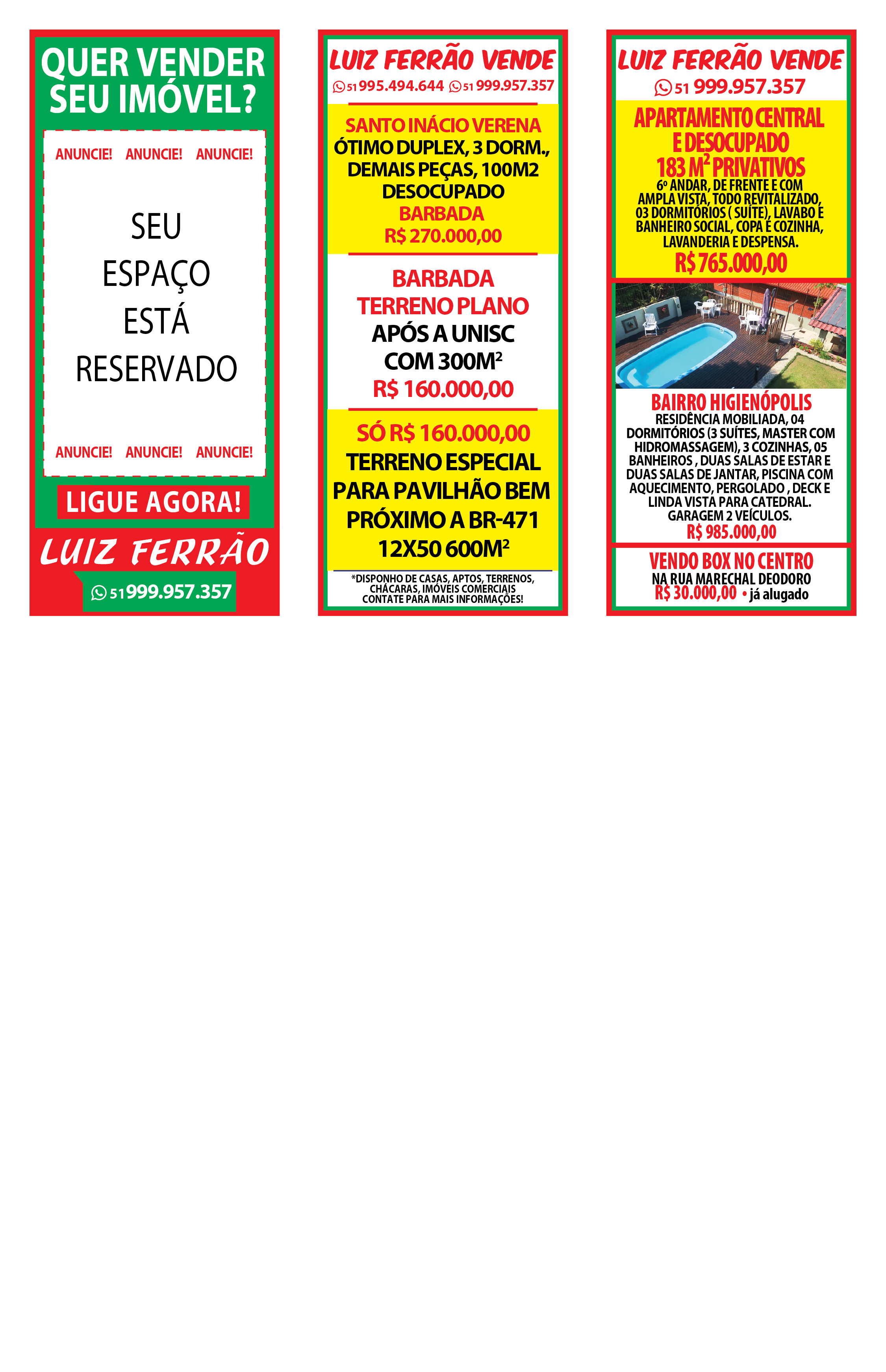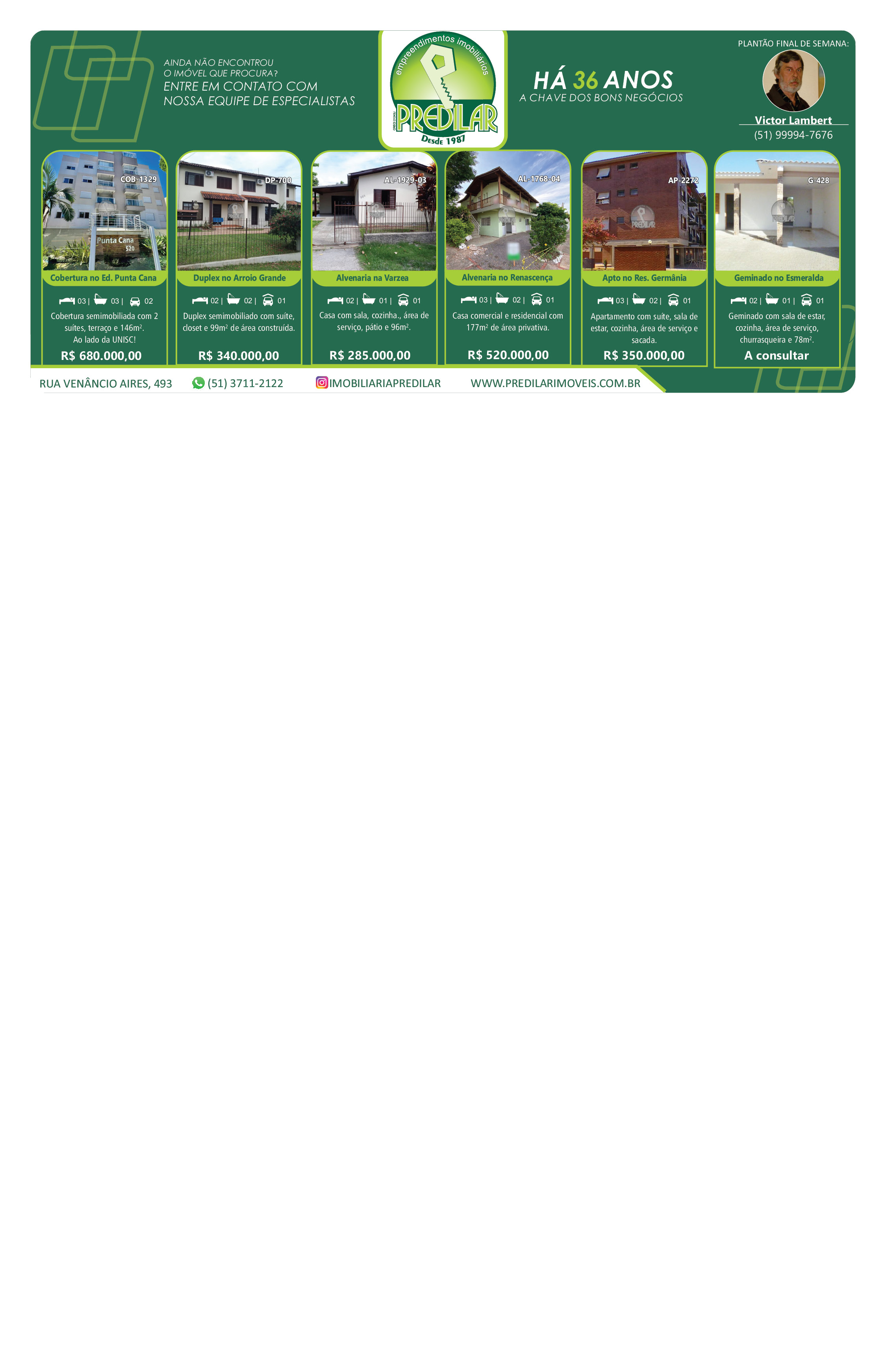 O suplemento de Classificados, que circula nas edições de terças, quintas e sábados, é um dos mais tradicionais da Gazeta do Sul, como vitrine e canal de negócios, de oferta, compra e venda em toda a região central do Rio Grande do Sul. E, para enriquecer pesquisas de produtos e serviços e possibilitar resultado ainda melhor a usuários e parceiros, nos anúncios de clientes cadastrados, o leitor tem acesso direto com link ao site do anunciante, onde poderá verificar mais detalhes sobre os itens. Confira as ofertas: