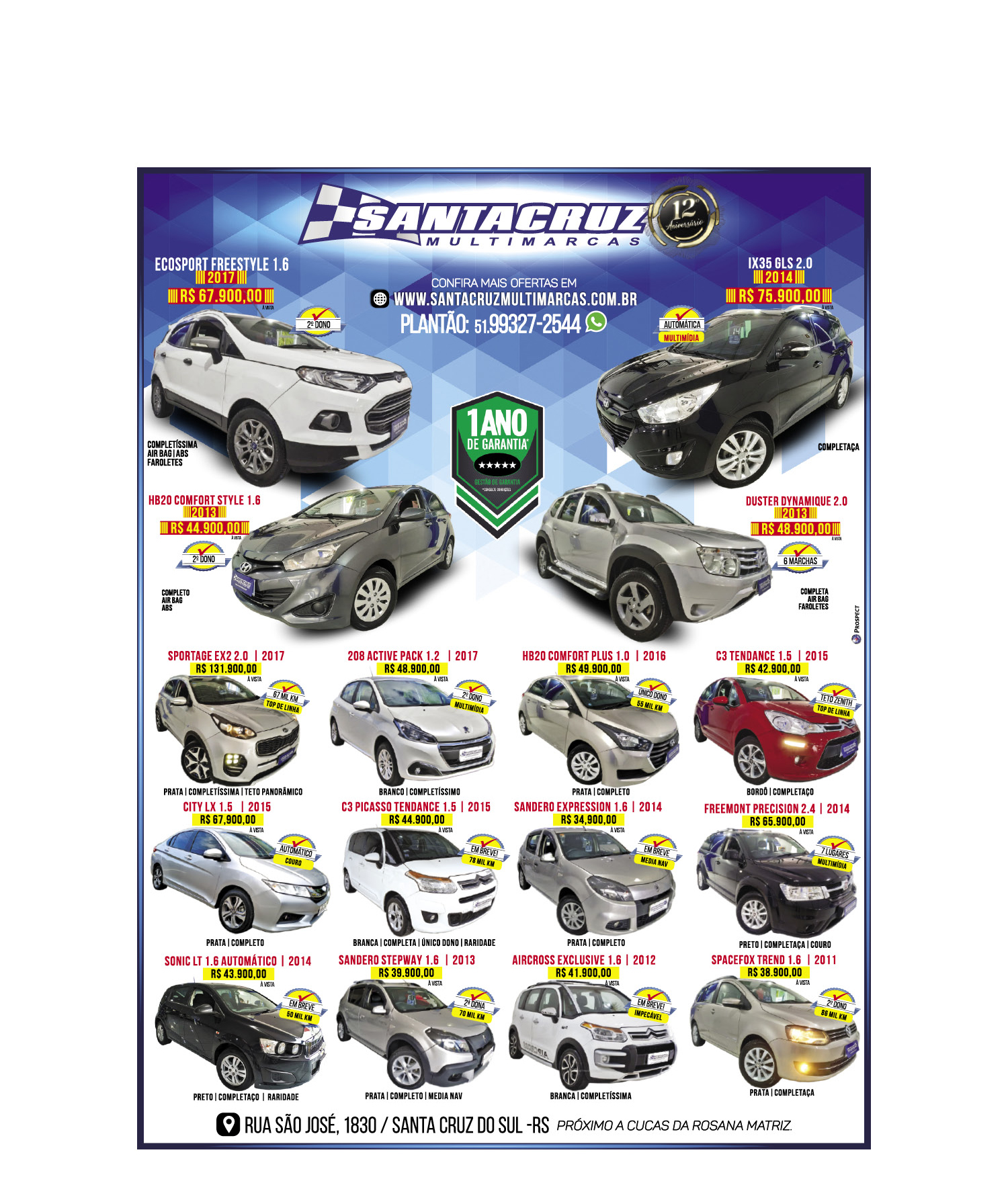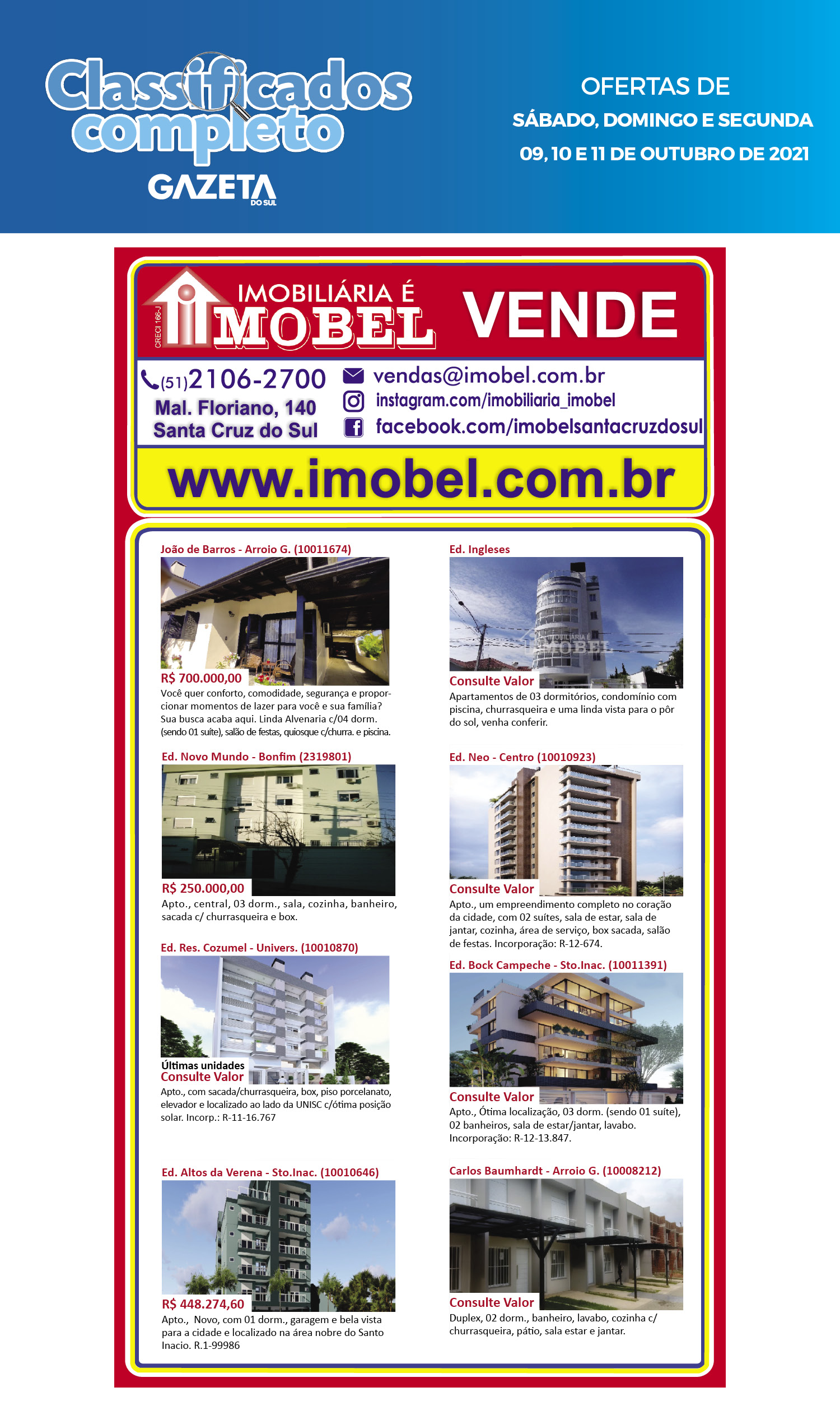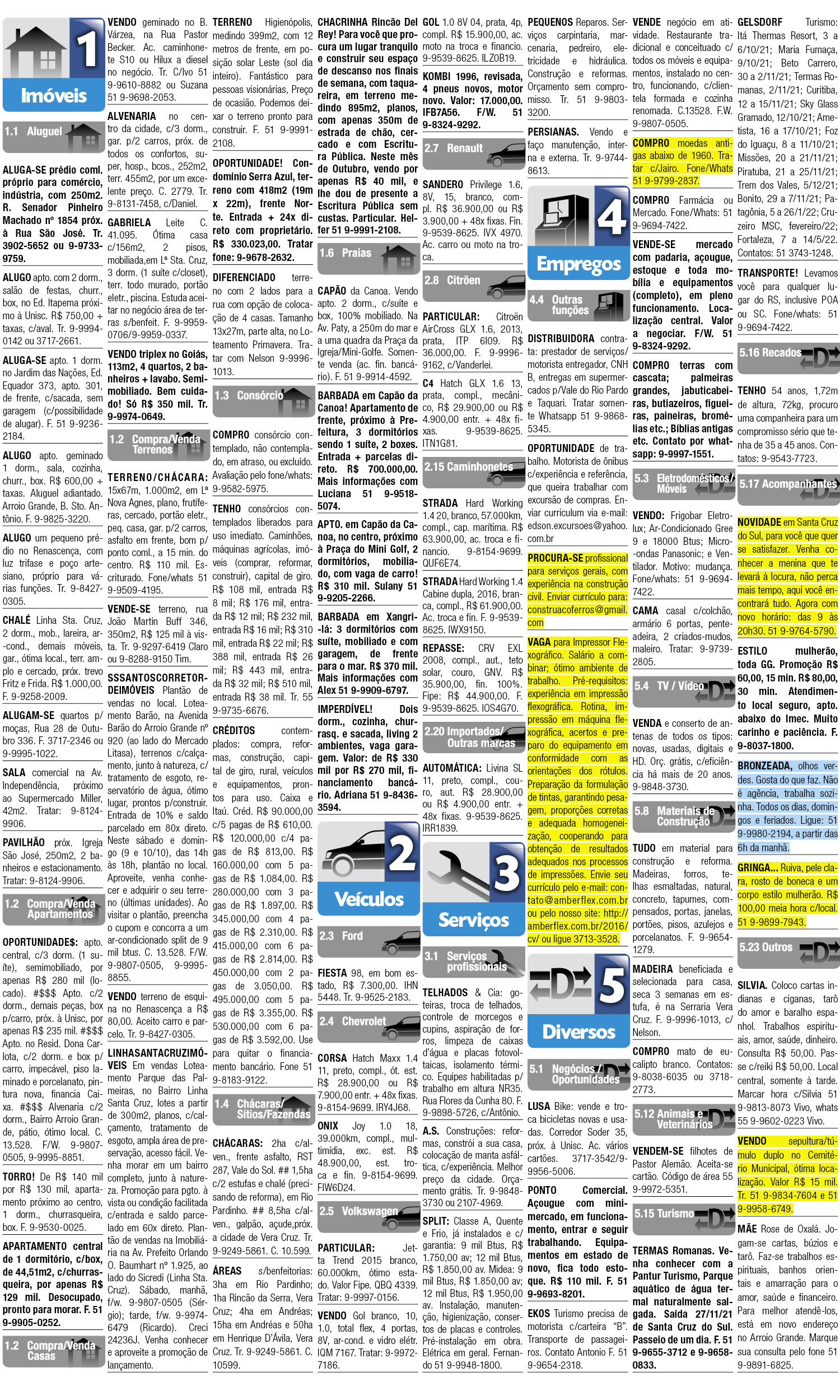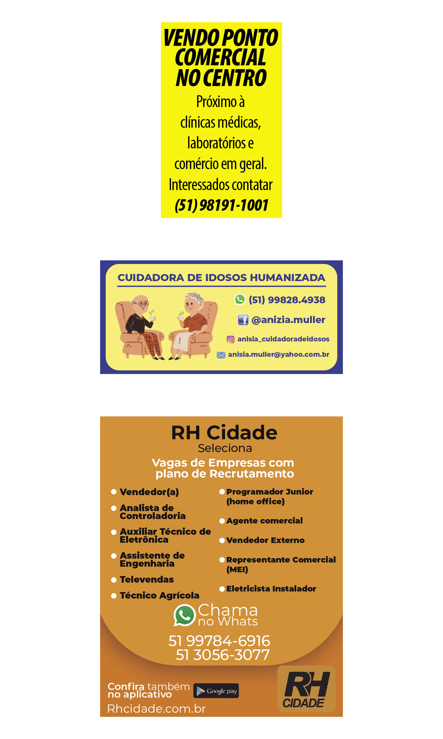 O suplemento de Classificados, que circula nas edições de terças, quintas e sábados, é um dos mais tradicionais da Gazeta do Sul, como vitrine e canal de negócios, de oferta, compra e venda em toda a região central do Rio Grande do Sul. E, para enriquecer pesquisas de produtos e serviços e possibilitar resultado ainda melhor a usuários e parceiros, nos anúncios de clientes cadastrados, o leitor tem acesso direto com link ao site do anunciante, onde poderá verificar mais detalhes sobre os itens. Confira as ofertas: