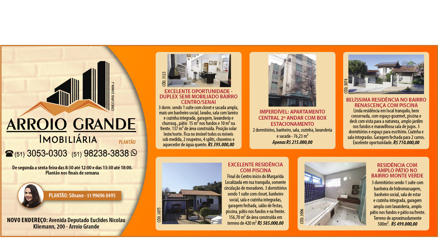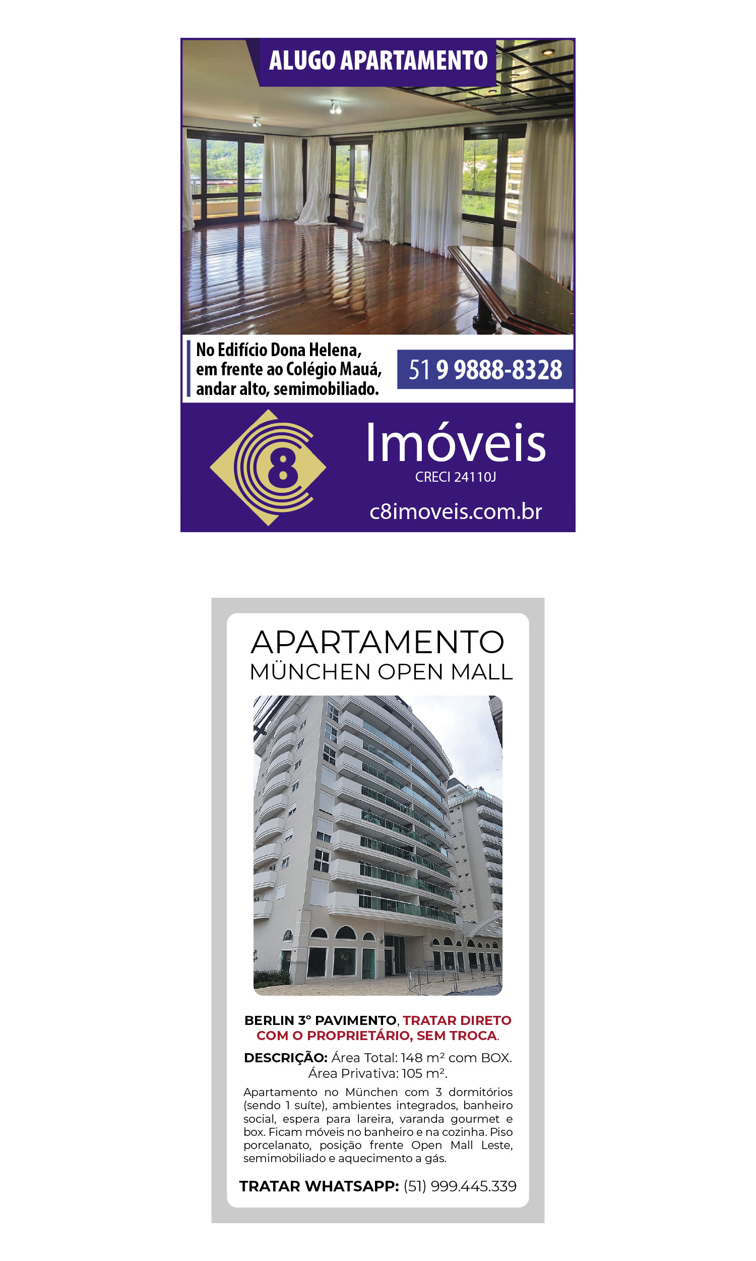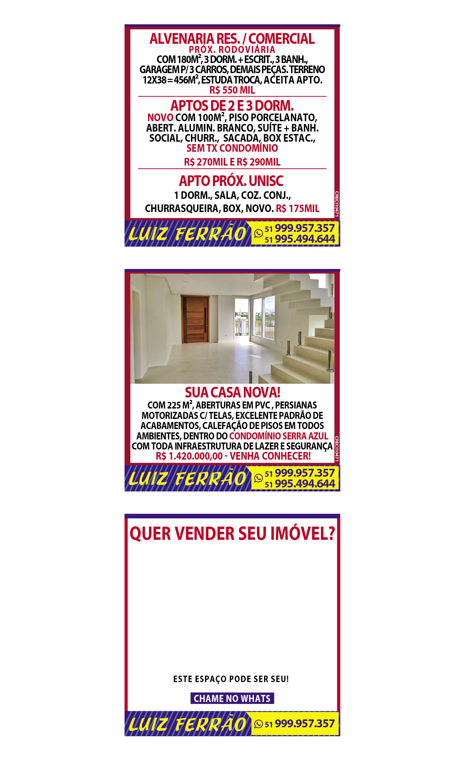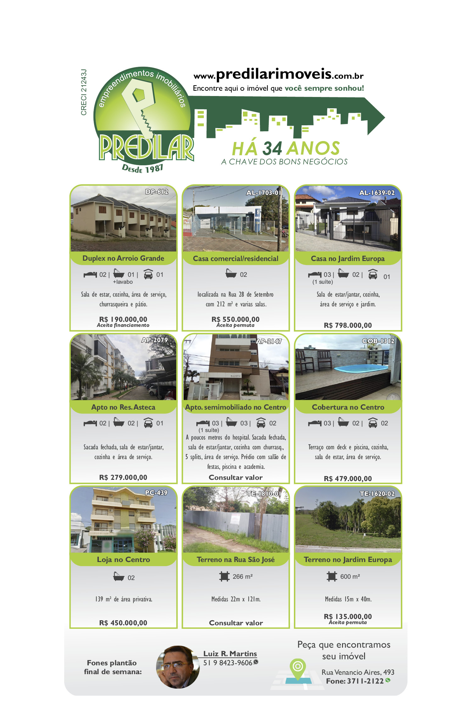 O suplemento de Classificados, que circula nas edições de terças, quintas e sábados, é um dos mais tradicionais da Gazeta do Sul, como vitrine e canal de negócios, de oferta, compra e venda em toda a região central do Rio Grande do Sul. E, para enriquecer pesquisas de produtos e serviços e possibilitar resultado ainda melhor a usuários e parceiros, nos anúncios de clientes cadastrados, o leitor tem acesso direto com link ao site do anunciante, onde poderá verificar mais detalhes sobre os itens. Confira as ofertas: