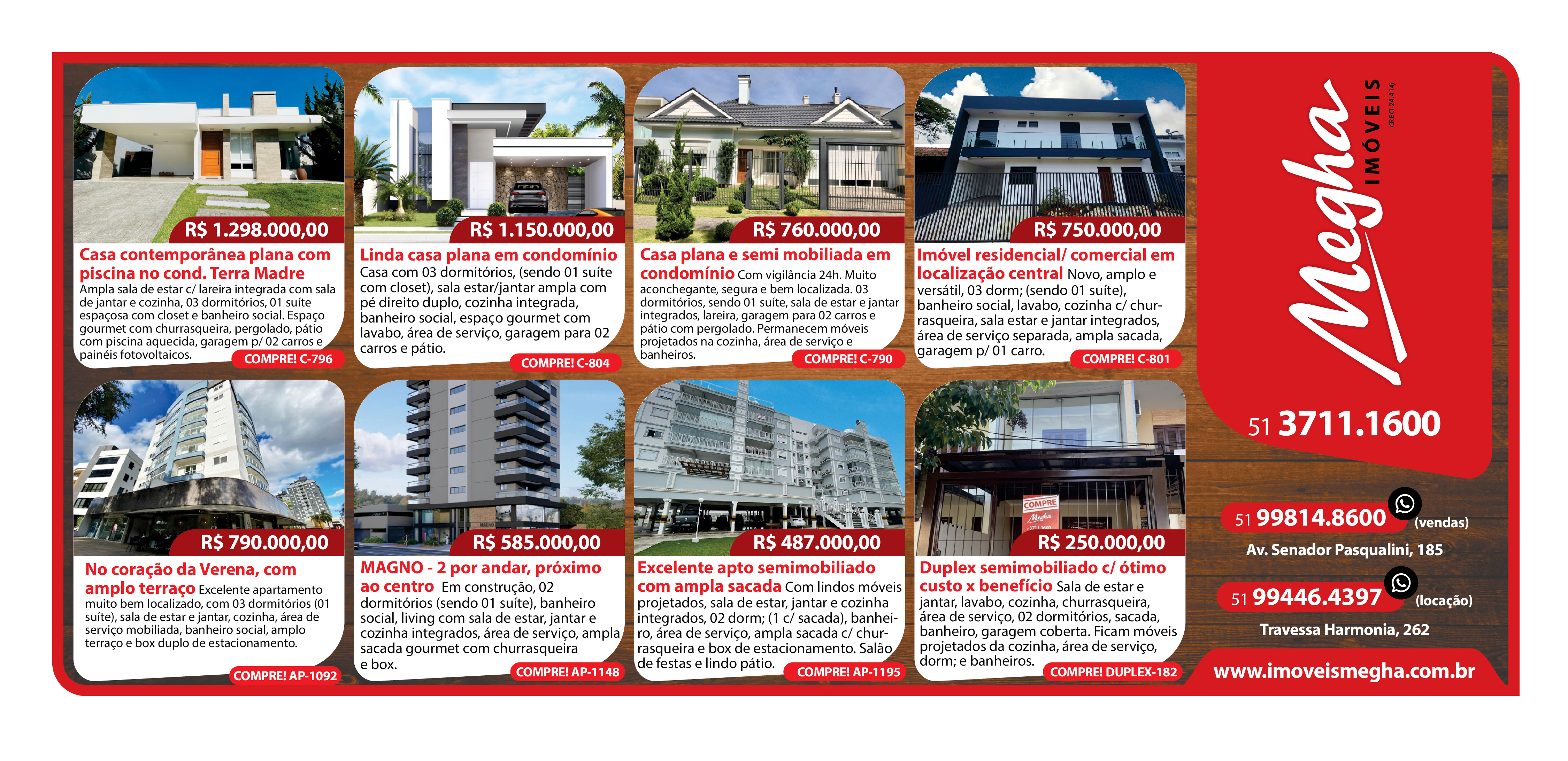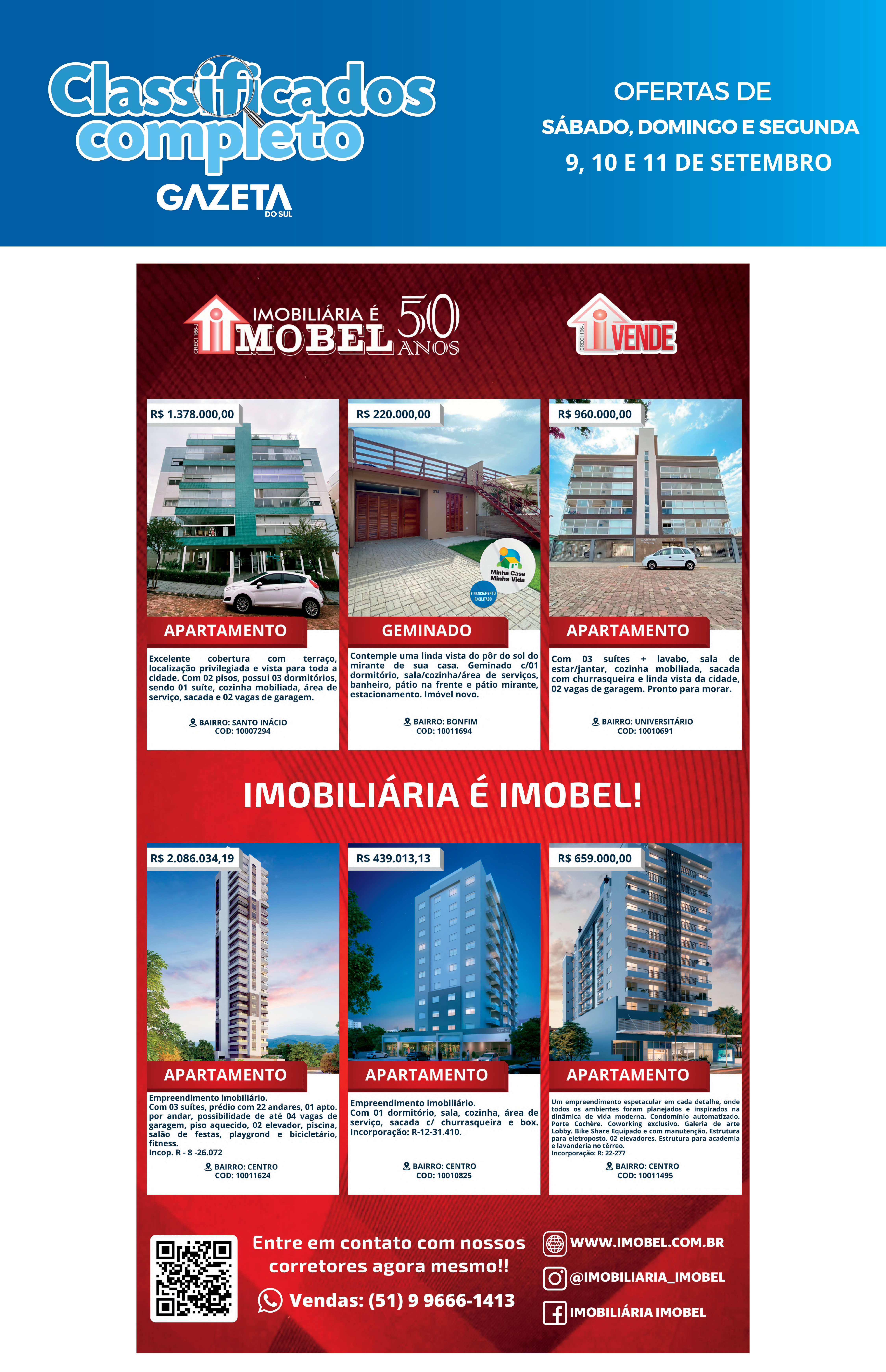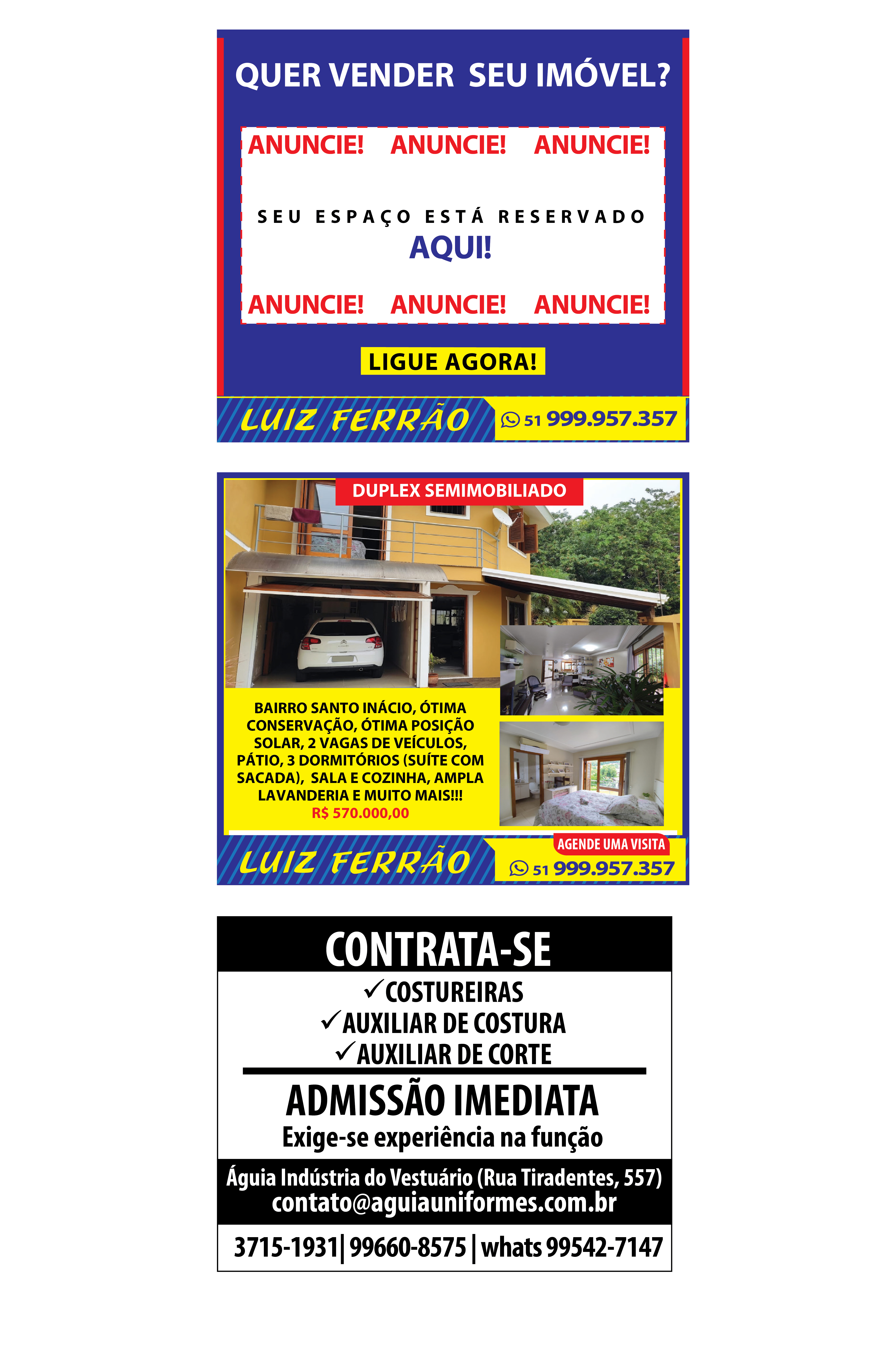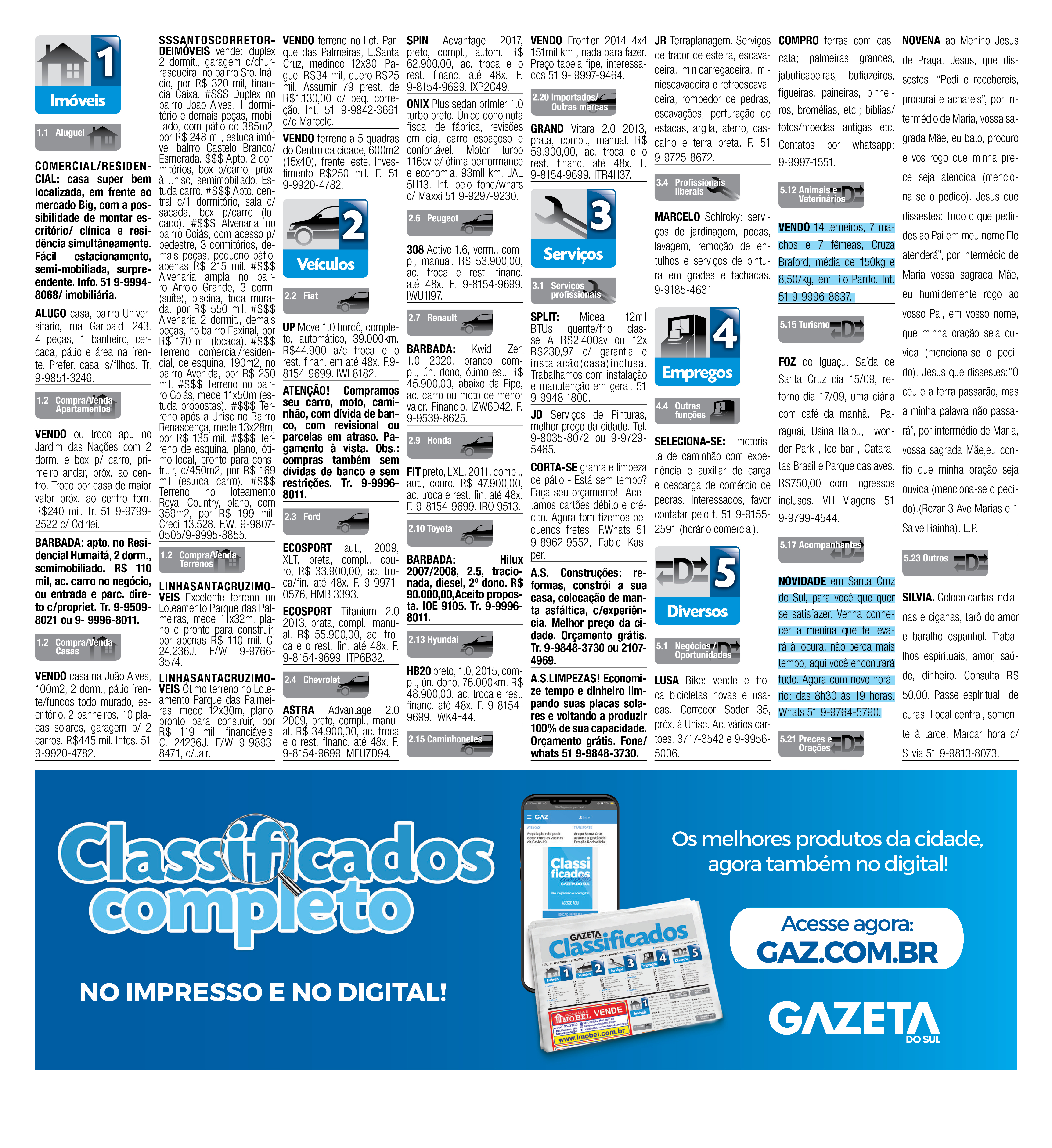 O suplemento de Classificados, que circula nas edições de terças, quintas e sábados, é um dos mais tradicionais da Gazeta do Sul, como vitrine e canal de negócios, de oferta, compra e venda em toda a região central do Rio Grande do Sul. E, para enriquecer pesquisas de produtos e serviços e possibilitar resultado ainda melhor a usuários e parceiros, nos anúncios de clientes cadastrados, o leitor tem acesso direto com link ao site do anunciante, onde poderá verificar mais detalhes sobre os itens. Confira as ofertas: