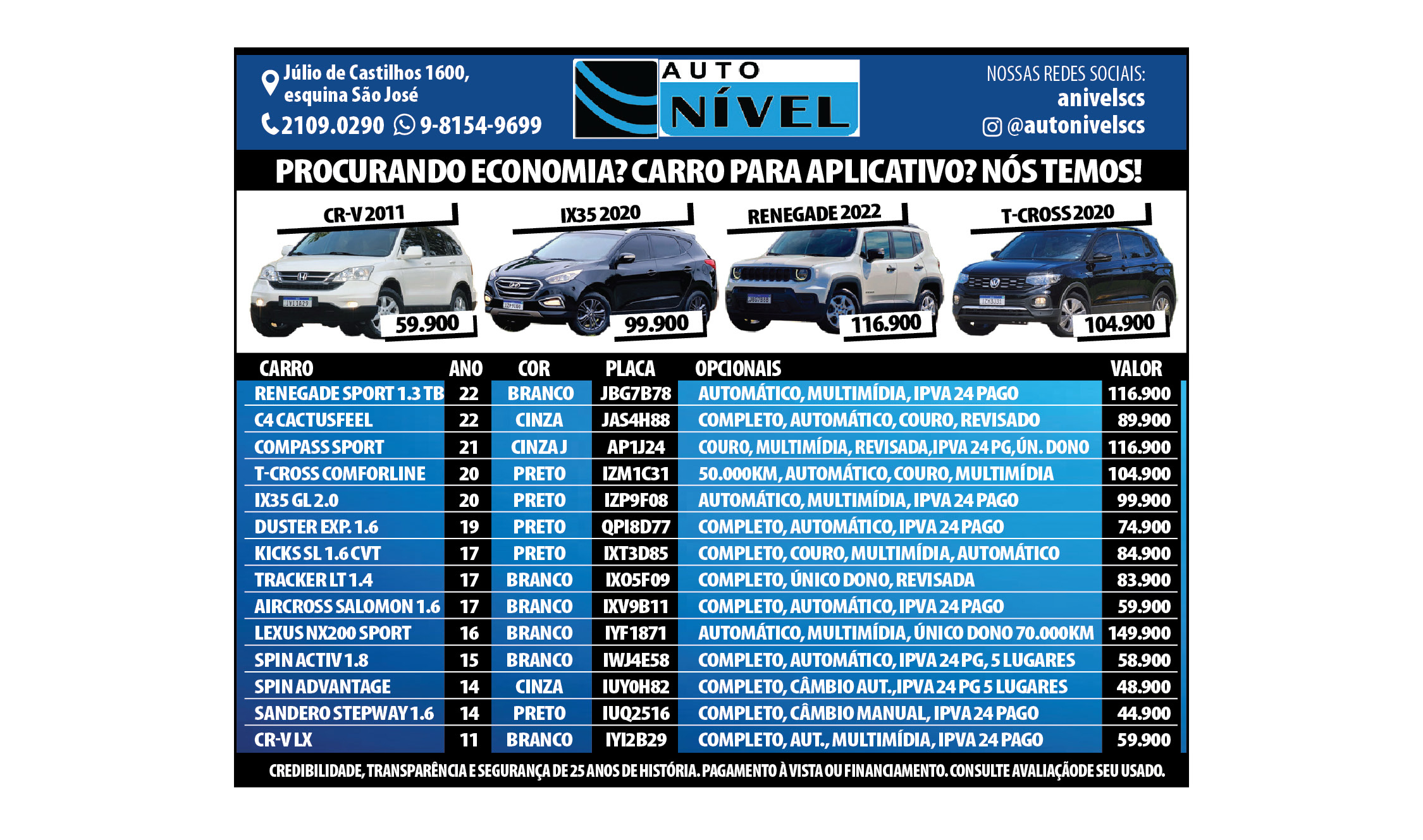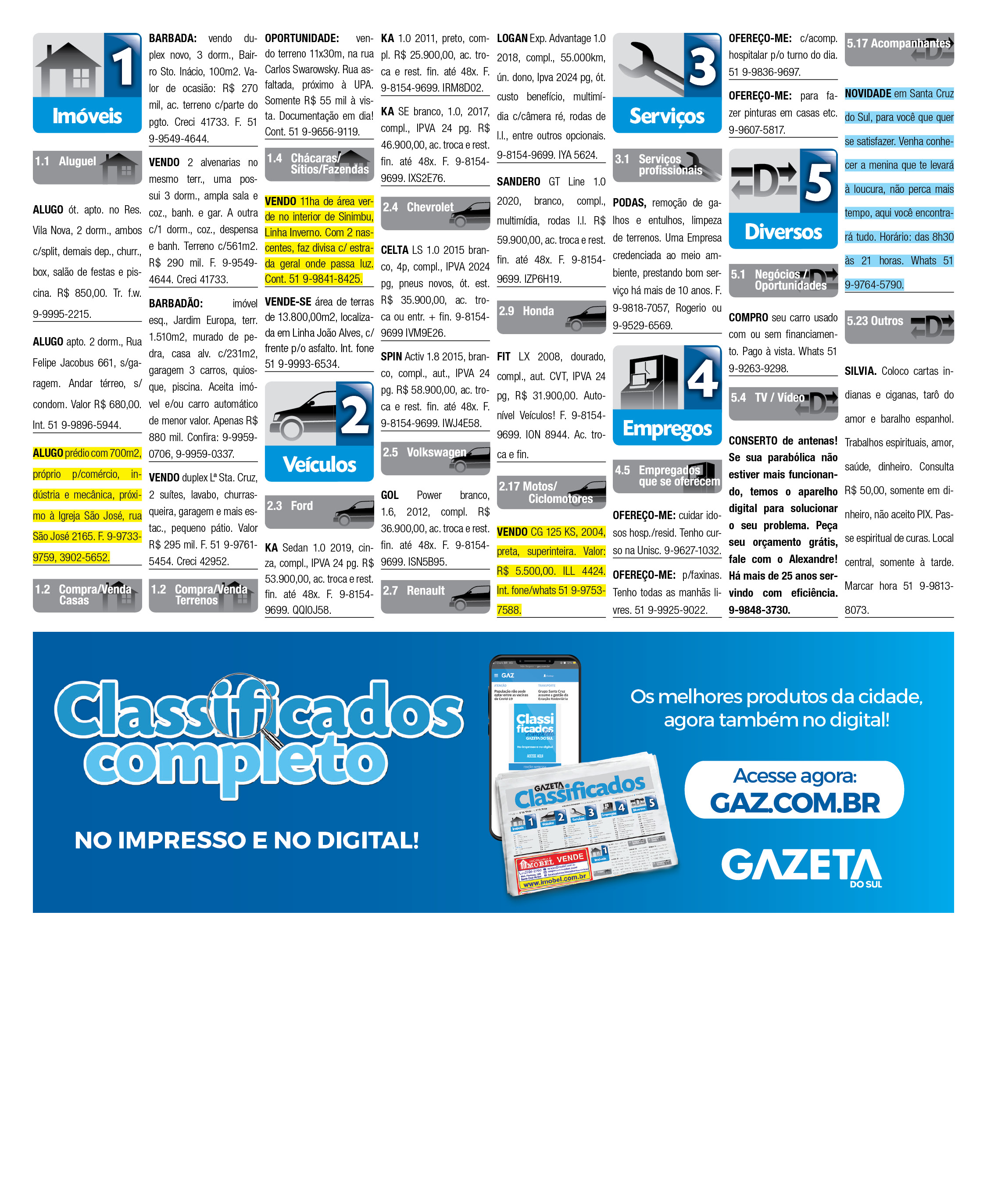 O suplemento de Classificados, que circula nas edições de terças, quintas e sábados, é um dos mais tradicionais da Gazeta do Sul, como vitrine e canal de negócios, de oferta, compra e venda em toda a região central do Rio Grande do Sul. E, para enriquecer pesquisas de produtos e serviços e possibilitar resultado ainda melhor a usuários e parceiros, nos anúncios de clientes cadastrados, o leitor tem acesso direto com link ao site do anunciante, onde poderá verificar mais detalhes sobre os itens. Confira as ofertas: