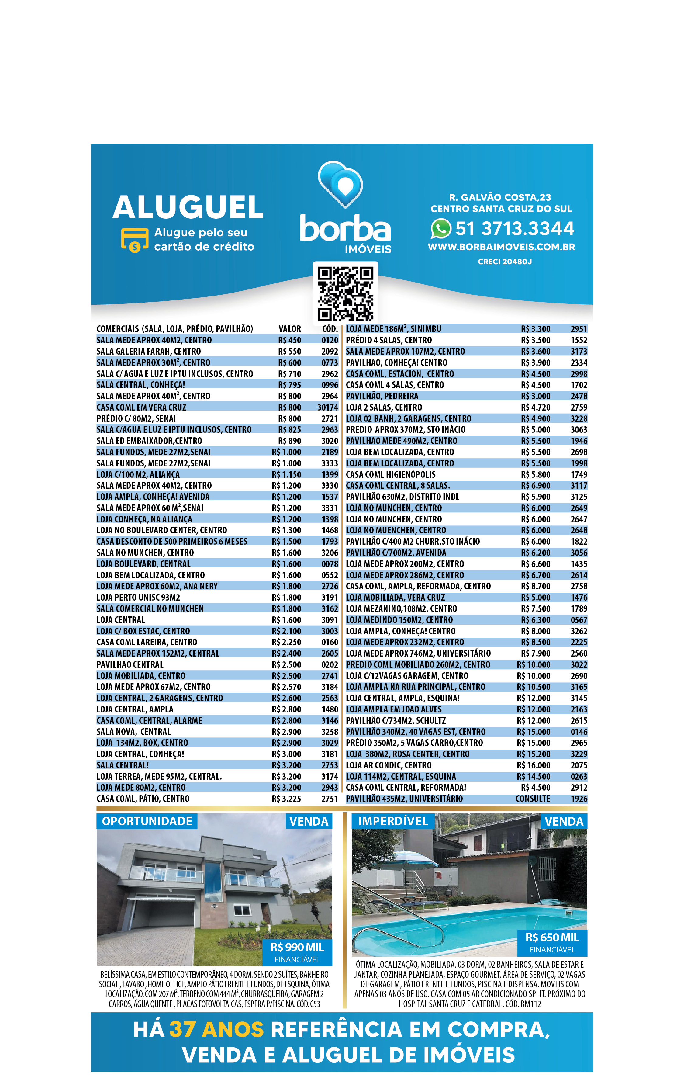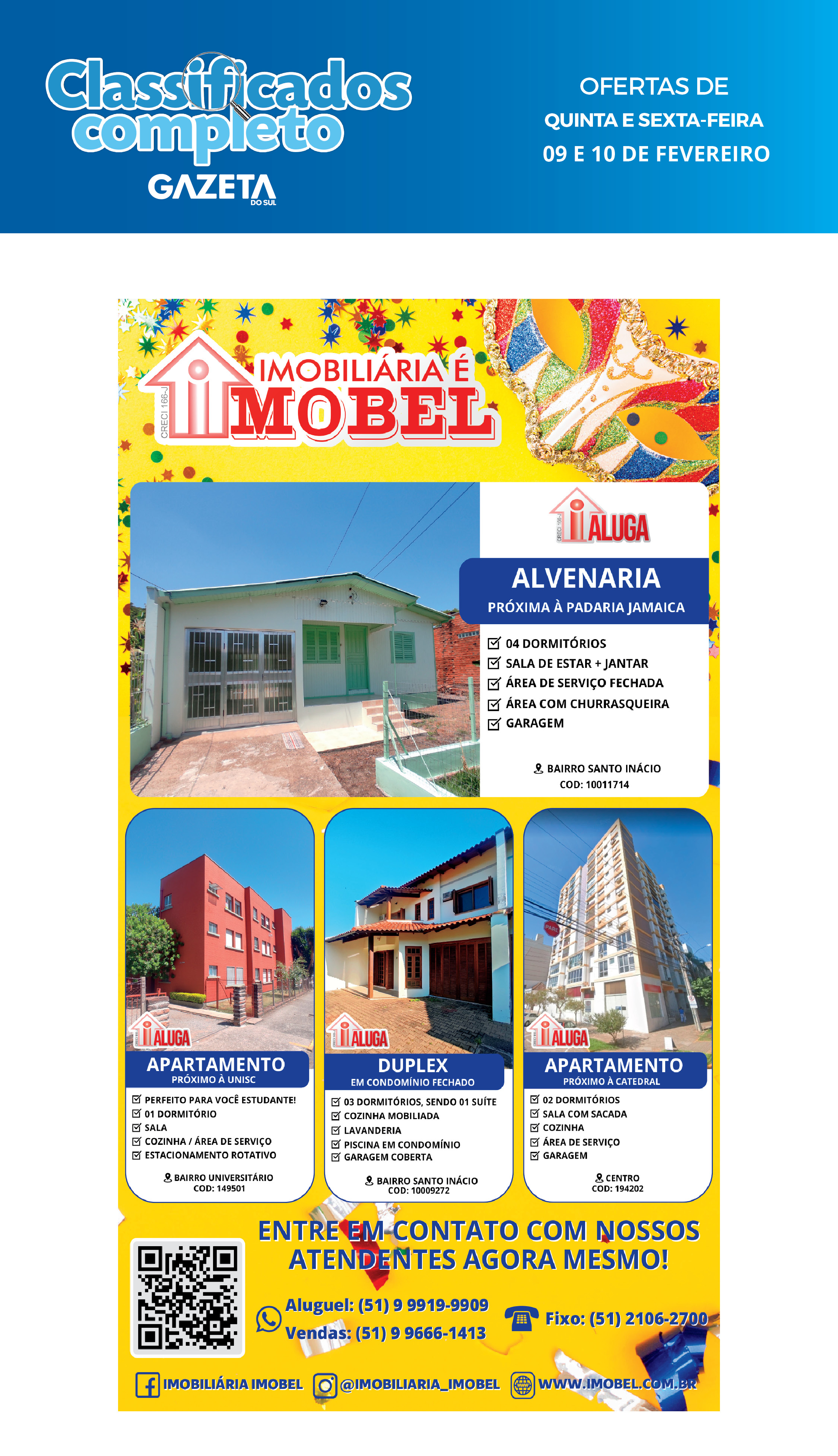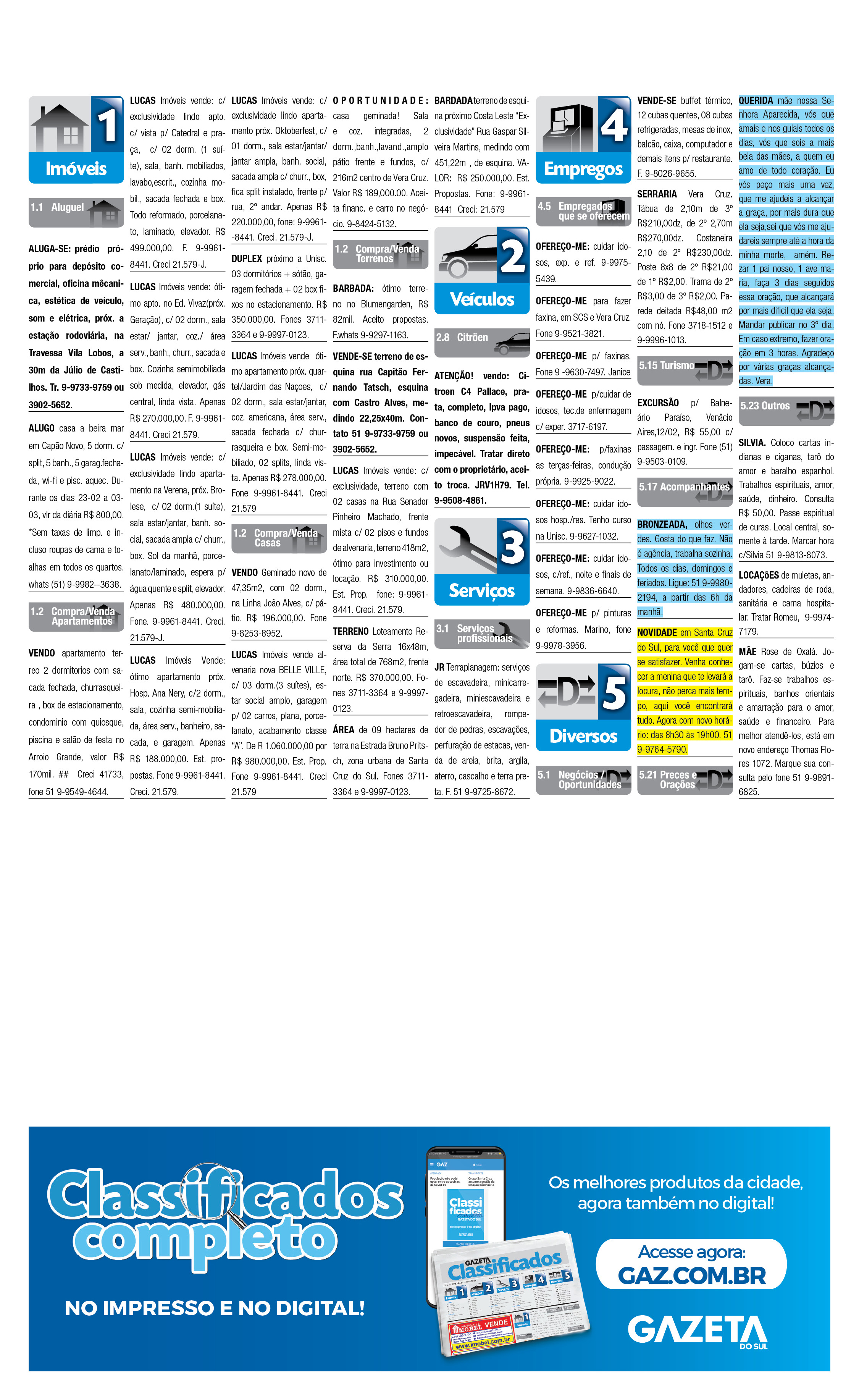 O suplemento de Classificados, que circula nas edições de terças, quintas e sábados, é um dos mais tradicionais da Gazeta do Sul, como vitrine e canal de negócios, de oferta, compra e venda em toda a região central do Rio Grande do Sul. E, para enriquecer pesquisas de produtos e serviços e possibilitar resultado ainda melhor a usuários e parceiros, nos anúncios de clientes cadastrados, o leitor tem acesso direto com link ao site do anunciante, onde poderá verificar mais detalhes sobre os itens. Confira as ofertas: