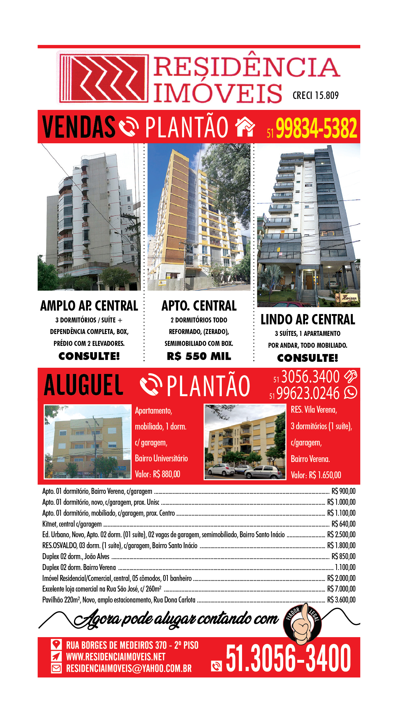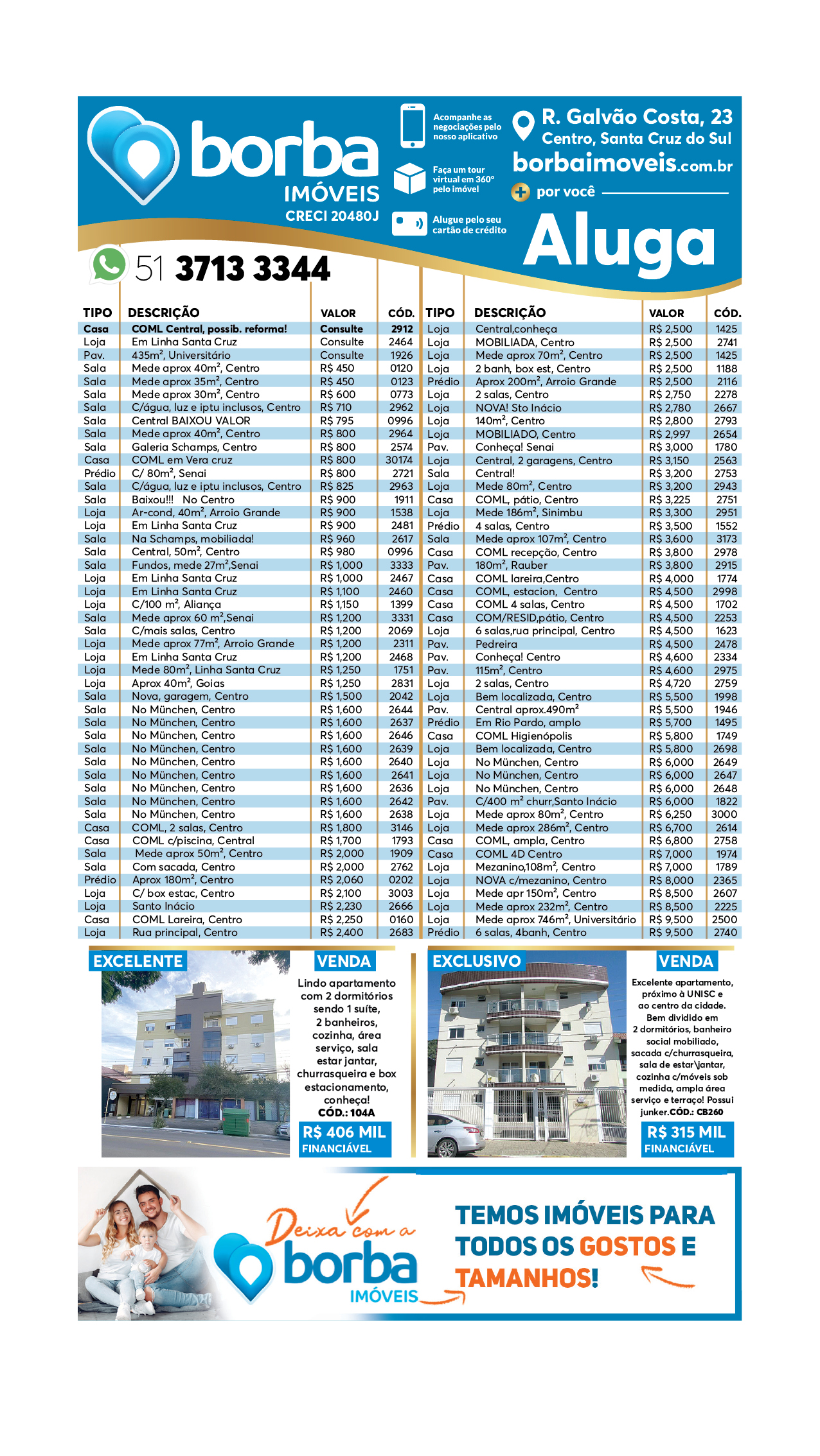 O suplemento de Classificados, que circula nas edições de terças, quintas e sábados, é um dos mais tradicionais da Gazeta do Sul, como vitrine e canal de negócios, de oferta, compra e venda em toda a região central do Rio Grande do Sul. E, para enriquecer pesquisas de produtos e serviços e possibilitar resultado ainda melhor a usuários e parceiros, nos anúncios de clientes cadastrados, o leitor tem acesso direto com link ao site do anunciante, onde poderá verificar mais detalhes sobre os itens. Confira as ofertas: