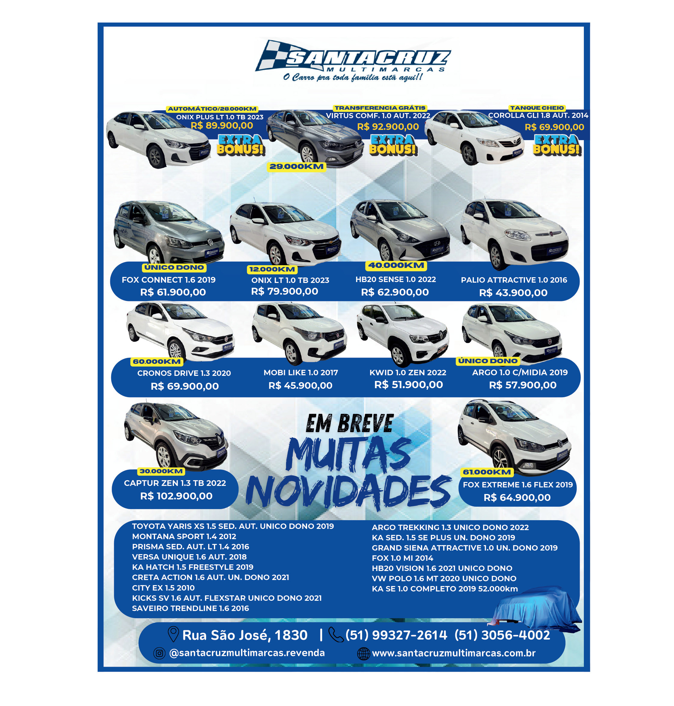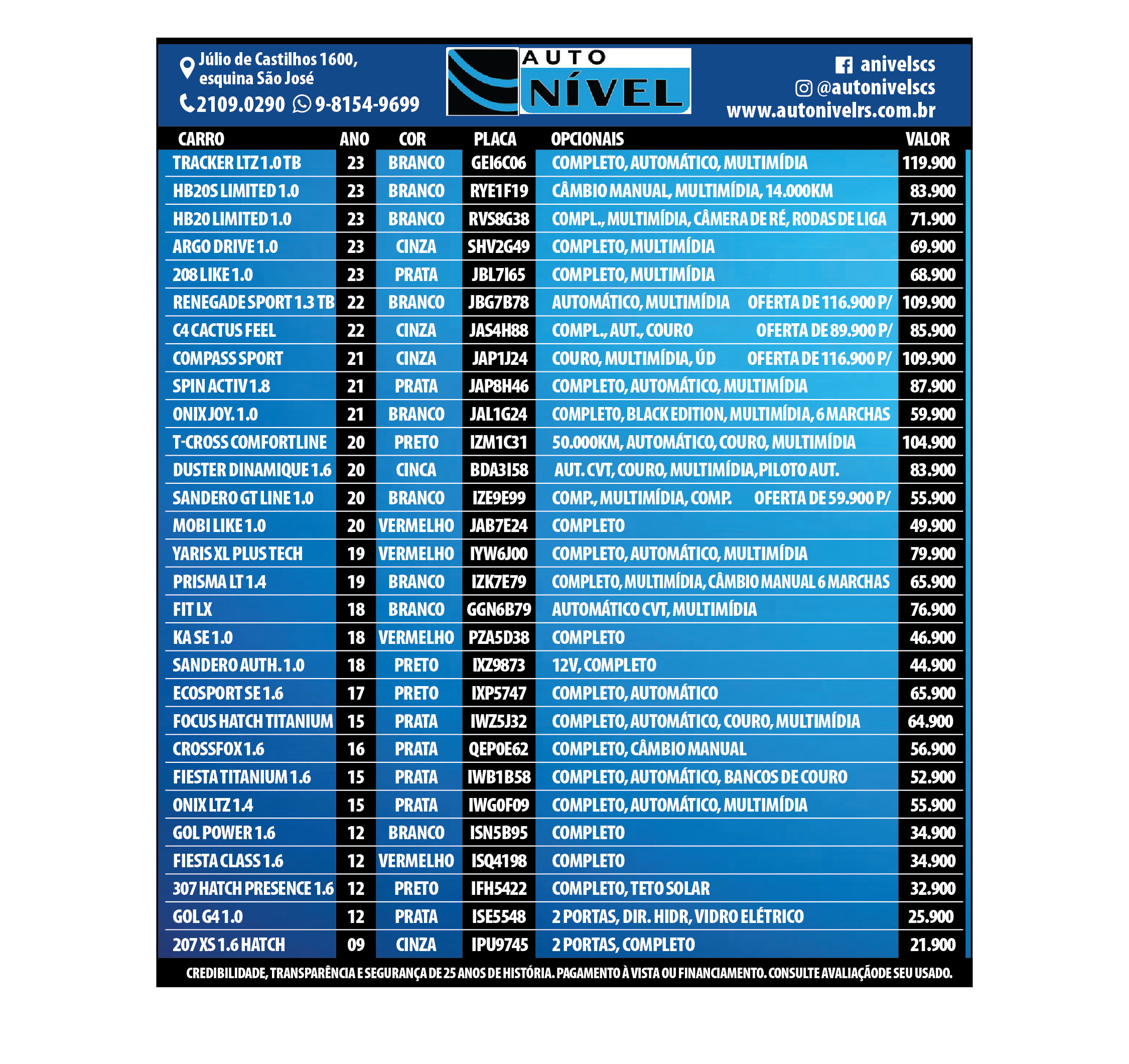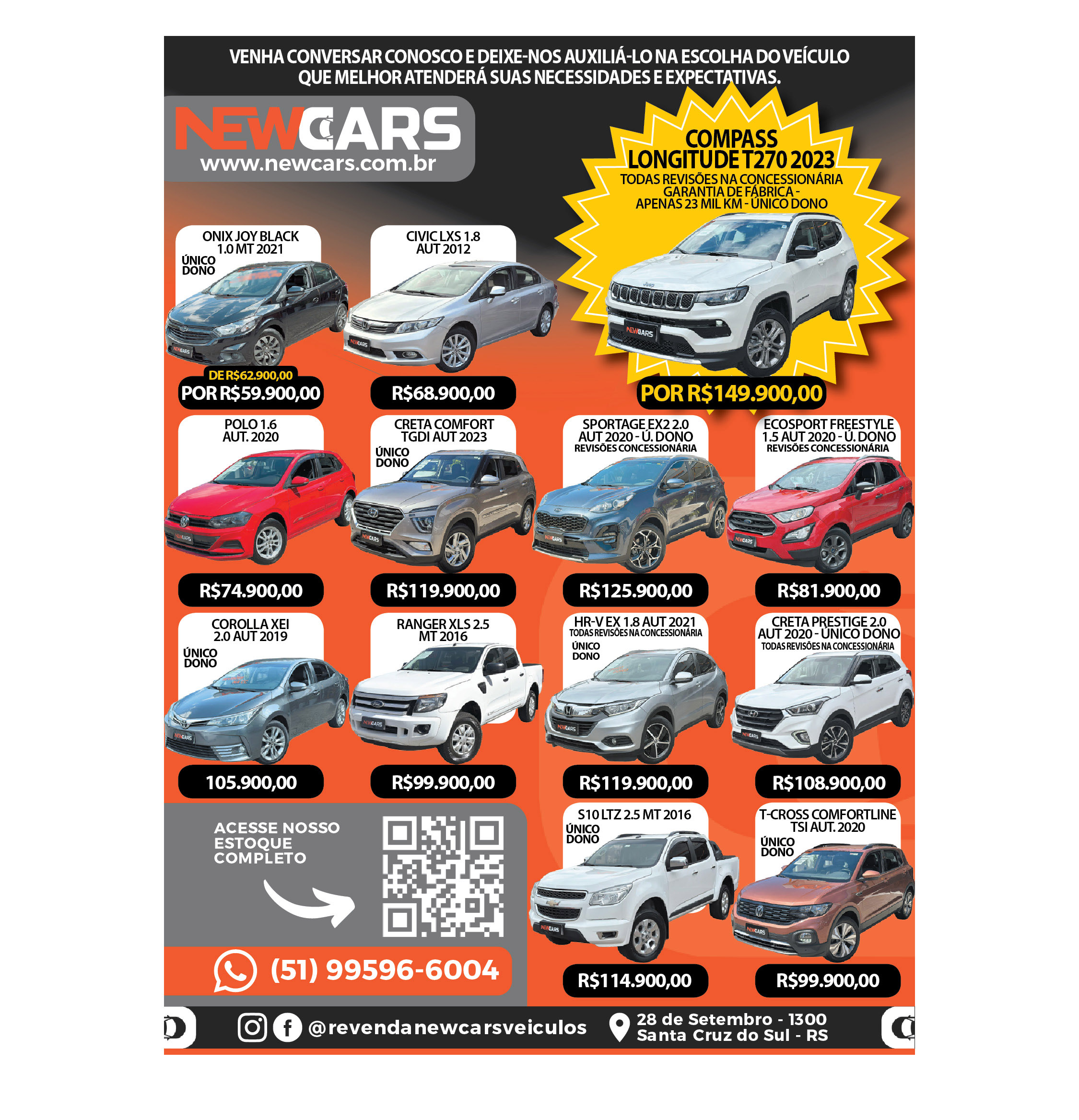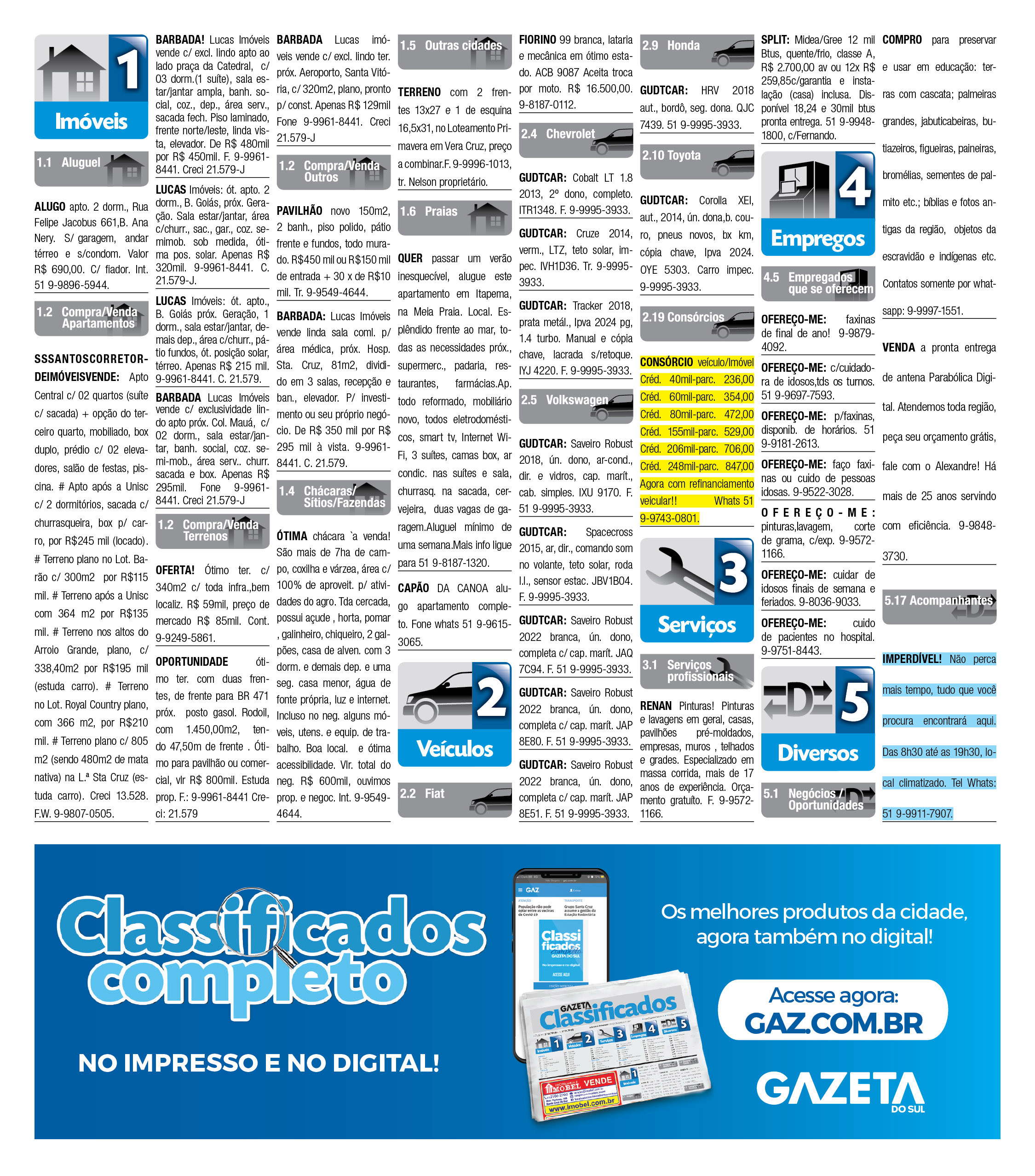 O suplemento de Classificados, que circula nas edições de terças, quintas e sábados, é um dos mais tradicionais da Gazeta do Sul, como vitrine e canal de negócios, de oferta, compra e venda em toda a região central do Rio Grande do Sul. E, para enriquecer pesquisas de produtos e serviços e possibilitar resultado ainda melhor a usuários e parceiros, nos anúncios de clientes cadastrados, o leitor tem acesso direto com link ao site do anunciante, onde poderá verificar mais detalhes sobre os itens. Confira as ofertas: