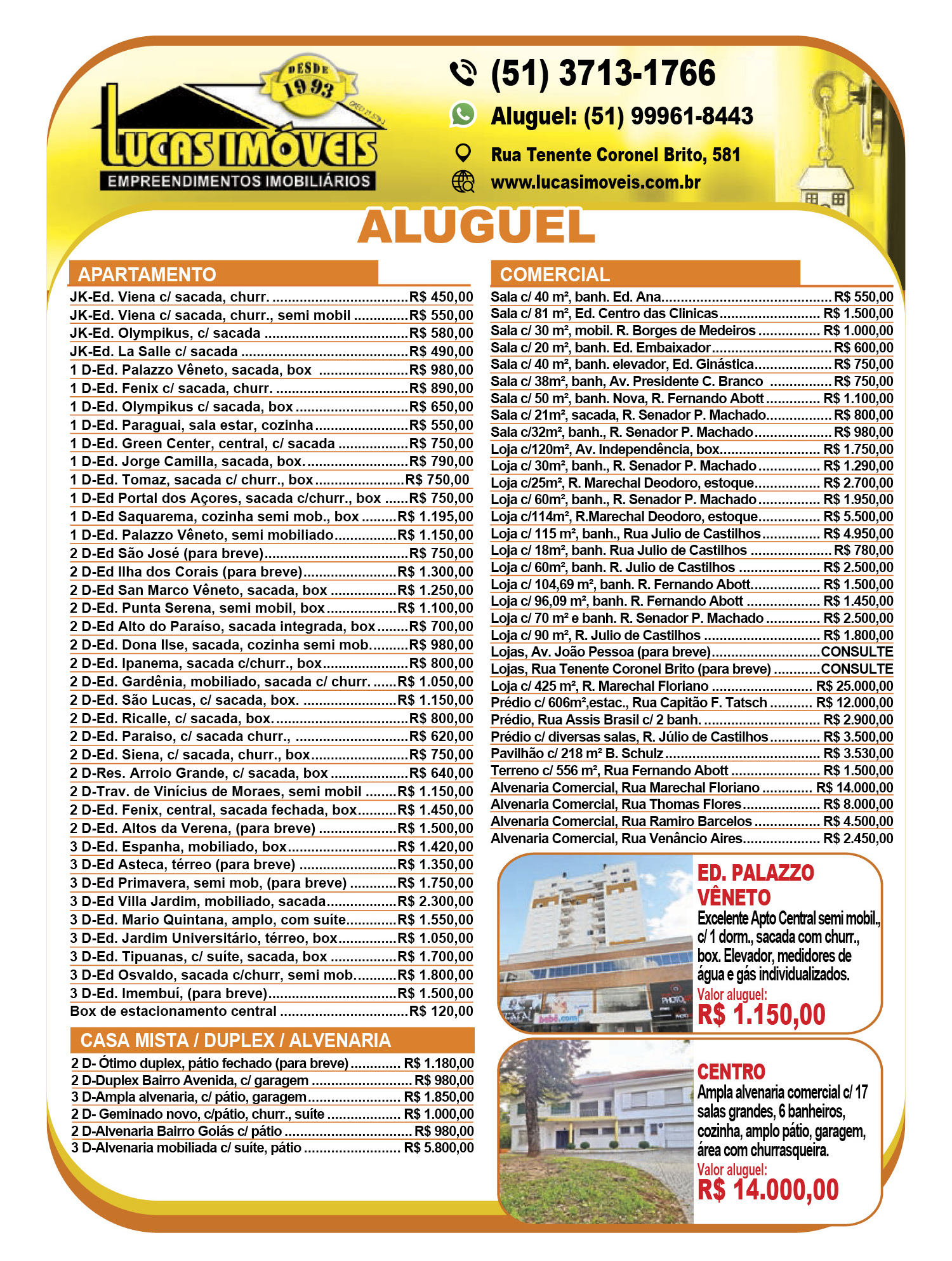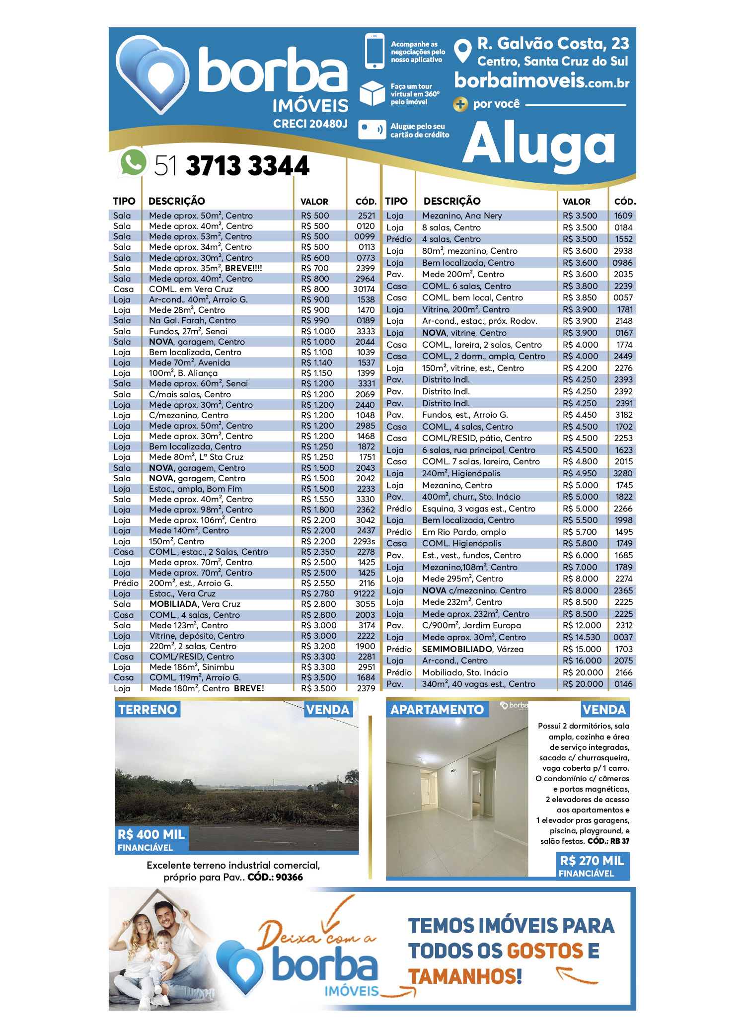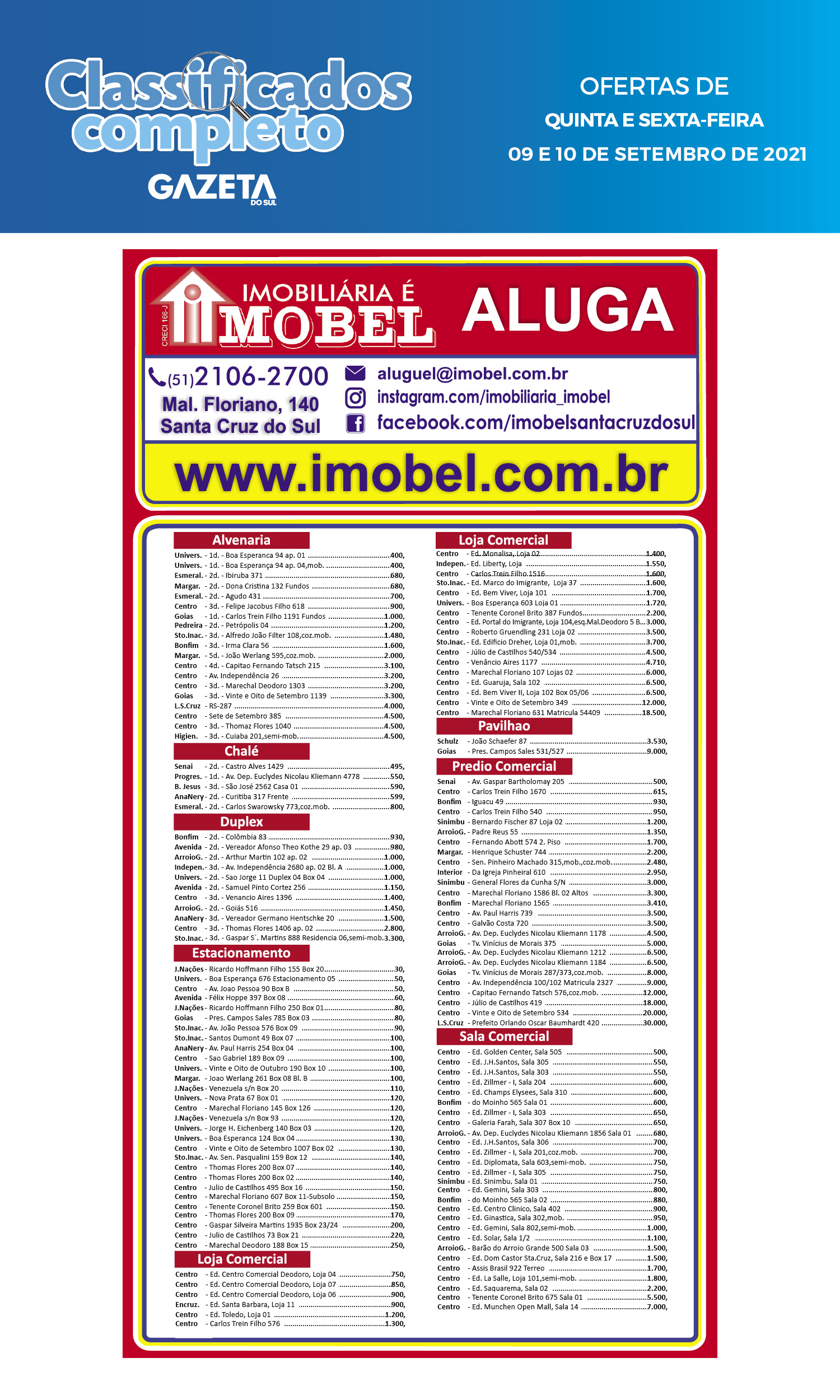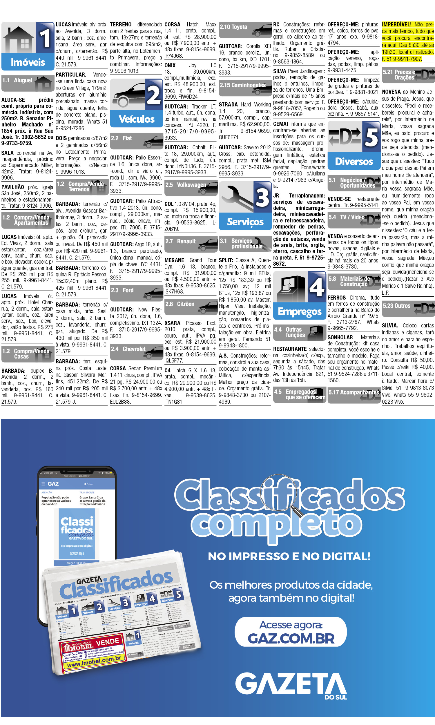 O suplemento de Classificados, que circula nas edições de terças, quintas e sábados, é um dos mais tradicionais da Gazeta do Sul, como vitrine e canal de negócios, de oferta, compra e venda em toda a região central do Rio Grande do Sul. E, para enriquecer pesquisas de produtos e serviços e possibilitar resultado ainda melhor a usuários e parceiros, nos anúncios de clientes cadastrados, o leitor tem acesso direto com link ao site do anunciante, onde poderá verificar mais detalhes sobre os itens. Confira: