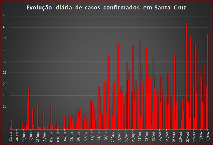 Desde o início da pandemia, Santa Cruz confirmou 1.764 casos de Covid-19. Destas pessoas que tiveram teste positivo, 1.597 estão recuperadas e 13 faleceram.