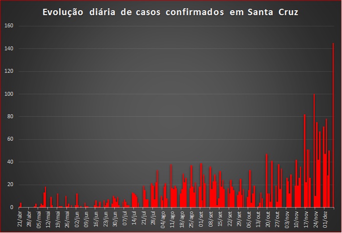 Esta é a maior alta de casos de Covid-19 já registrada em Santa Cruz do Sul. O recorde anterior era um aumento de 100 casos, no dia 23 de novembro, também uma segunda-feira. Os boletins de segunda trazem informação sobre três dias, somando o sábado e o domingo, já que a Secretaria Municipal da Saúde de Santa Cruz só divulga os dados em dias úteis.