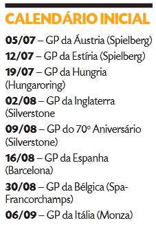 No caso do primeiro país, o circuito Red Bull Ring recebe o GP da Áustria, no dia 5 de julho, e o GP da Estíria, estado austríaco onde se localiza o autódromo, na cidade de Spielberg, no final de semana seguinte. Já Silverstone vira casa do GP da Inglaterra, no dia 2 de agosto, e o GP do Aniversário de 70 anos, no dia 9.