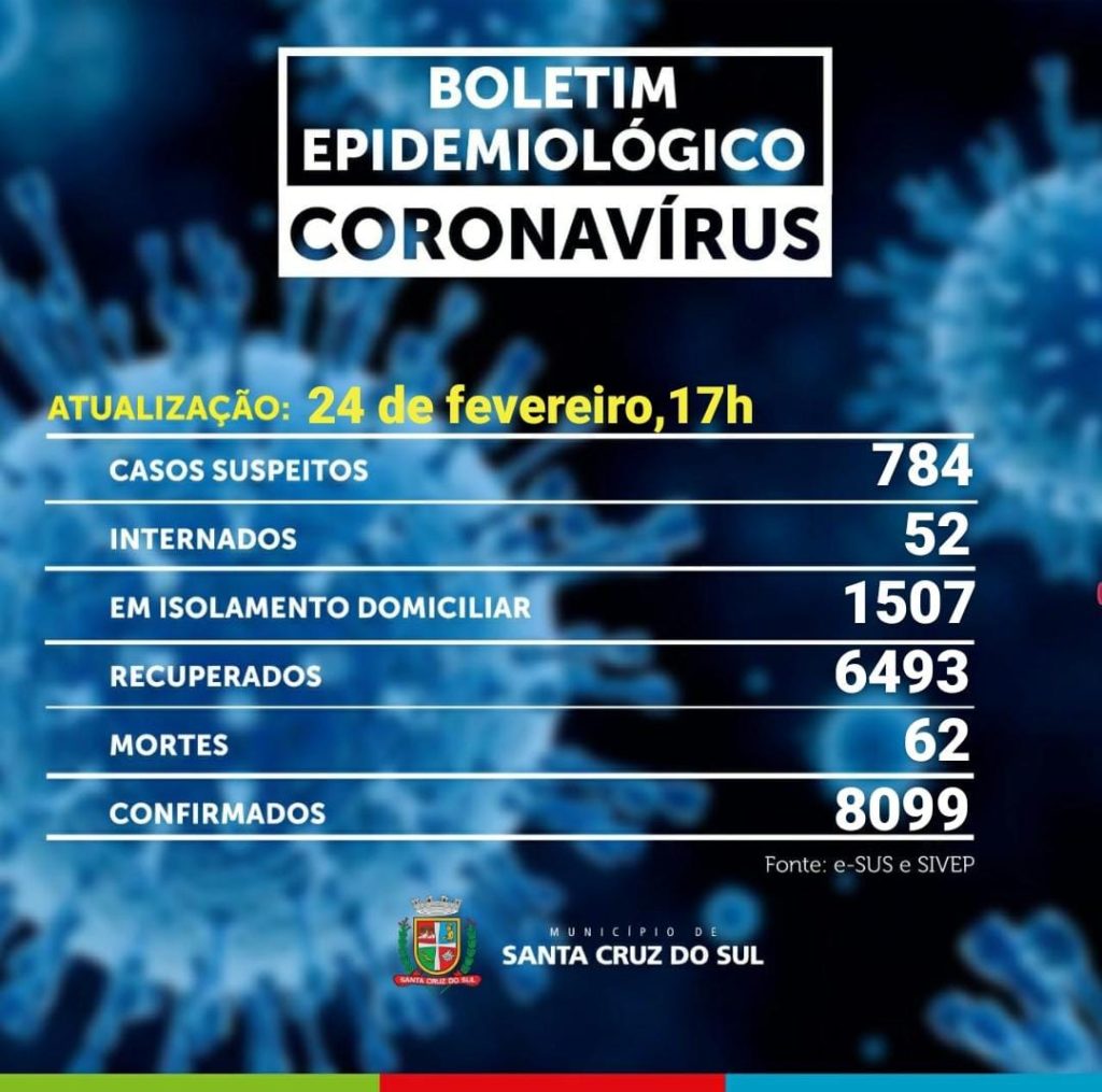Além do óbito, foram confirmados nesta quarta 175 novos casos da doença entre moradores do município. O total de pessoas com teste positivo em Santa Cruz chegou a 8.099, dos quais 62 faleceram e 6.493 estão recuperados.