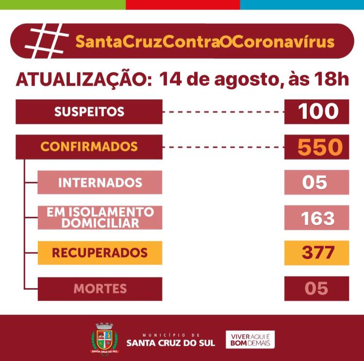 O boletim da Prefeitura de Santa Cruz do Sul, com dados até as 18 horas desta sexta-feira, registra 17 novos casos de Covid-19, na comparação com os dados da quinta. Já foram identificados 550 testes positivos para o novo coronavírus entre moradores do município. Deste total, 168 ainda se recuperam da doença – 163 em isolamento domiciliar e cinco hospitalizados.