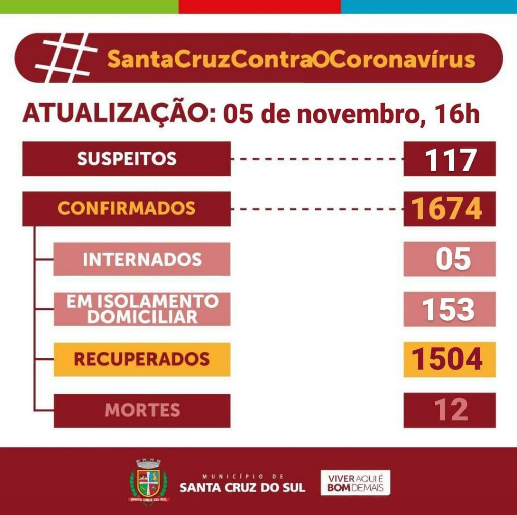 Santa Cruz do Sul registrou 1.674 casos de Covid-19 até esta quinta-feira, 5. Os dados estão no boletim diário da Secretaria Municipal da Saúde. O número é 12 registros maior do que o da quarta. Do total de moradores do município que tiveram teste positivo para o novo coronavírus, 12 faleceram e 1.504 estão recuperados.