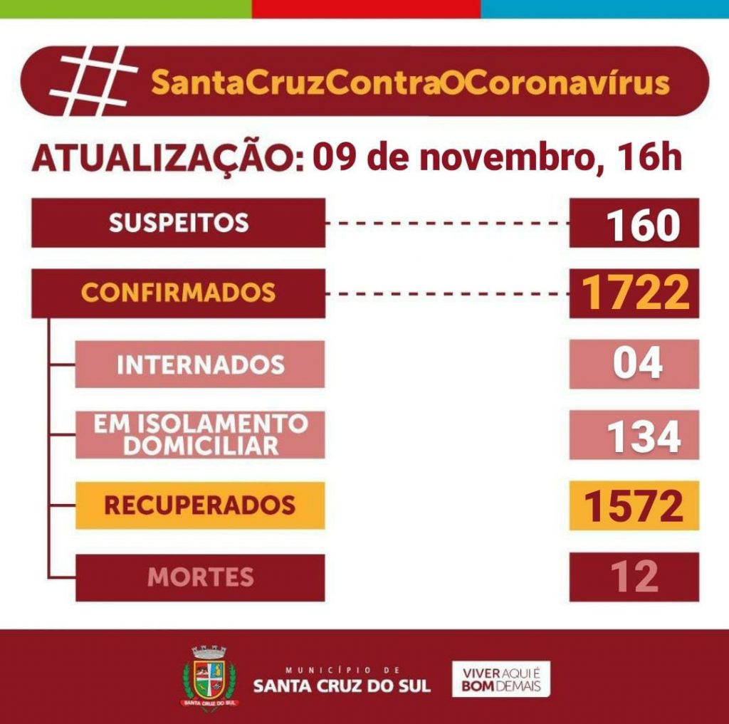O boletim da Secretaria da Saúde nesta segunda-feira registra 19 novos casos de infecção pelo novo coronavírus em Santa Cruz. O acumulado desde o início da pandemia chegou a 1.722 moradores do município com teste positivo, dos quais 1.572 estão recuperados e 12 faleceram.