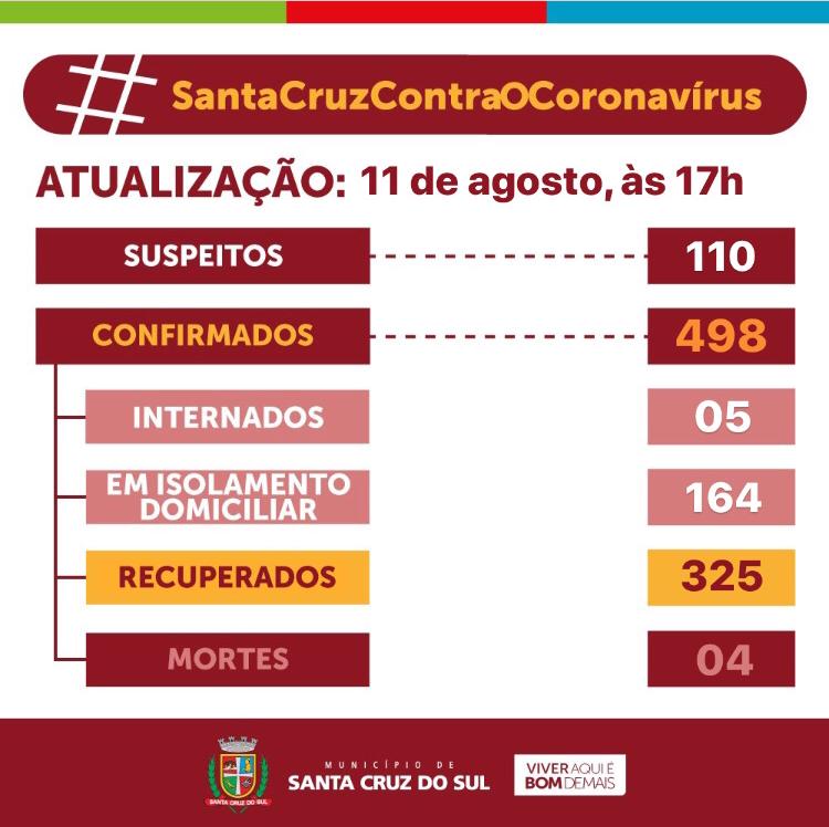 Desde o início da pandemia, já foram identificados 498 casos de Covid-19 entre moradores de Santa Cruz. Quatro pessoas morreram da doença e 325 se recuperaram, até agora.