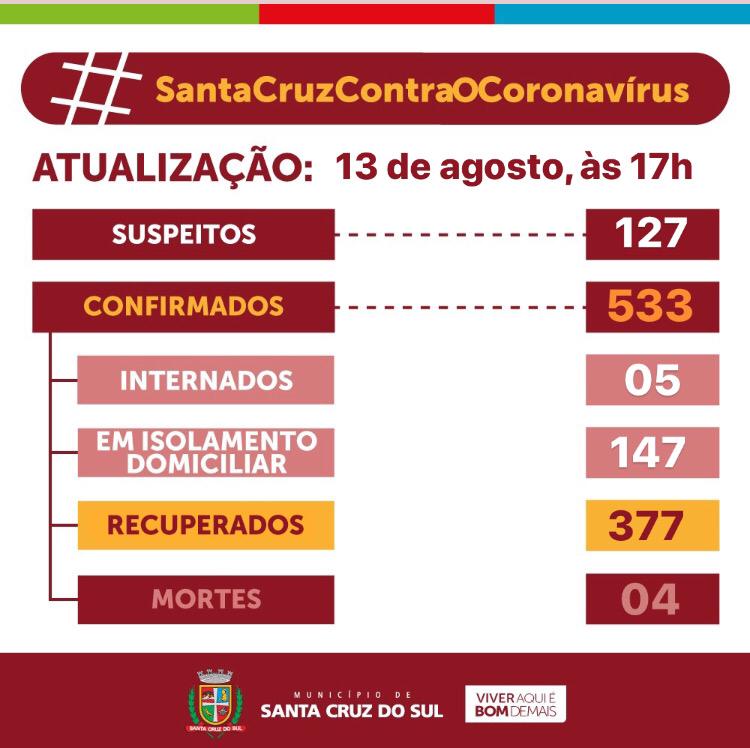 Desde que o coronavírus chegou a Santa Cruz, foram identificados 533 casos de Covid-19 no município, com quatro mortes causadas pela doença. Deste total, 377 pessoas estão recuperadas.