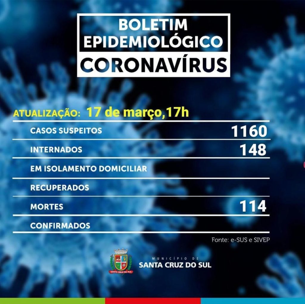 O boletim desta quarta informou que há 148 internações: 117 são moradores de Santa Cruz – 73 no Hospital Santa Cruz, 38 no Hospital Ana Nery e seis no Hospital Monte Alverne – e 31 são moradores de outros municípios. Há ainda 1.160 casos suspeitos que aguardam resultados de exames. Até o momento, são 114 óbitos pela doença no município.