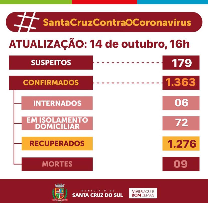 Foram confirmados quatro novos casos de Covid-19 entre moradores de Santa Cruz do Sul nesta quarta-feira, 14. Segundo o boletim da Secretaria Municipal da Saúde, o município acumula 1.363 testes positivos para a doença, com nove mortes relacionadas ao novo coronavírus.