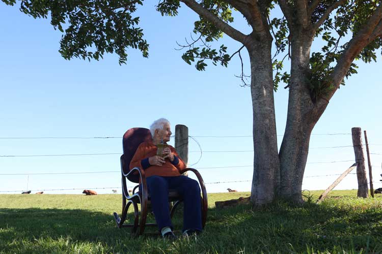 Na volta para dentro de casa, pois a sombra da frente da propriedade ficou fria na tarde de primavera, dona Glória entra na companhia dos guris Osvaldo e Romeu. Com seu apoio – é assim que ela chama a bengala, feita de um galho –, dá uma deslizada e se desequilibra, bem pouquinho. “Tu bebeste, mãe?”, indaga Osvaldo. “Parece que sim, né, meu filho? Acho que com essa idade eu posso”, e troca a tensão pelo riso e ensina que este é o elixir dos centenários.