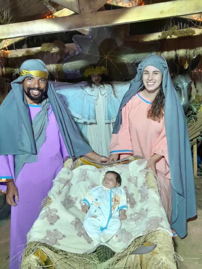 Rodeados pelos Reis Magos no carro do Presépio estão Maria e seu filho, o menino Jesus. Os dois personagens são interpretados pela porteira remota Giulia Tauana Cornélio, de 22 anos, e por sua filha Maitê Vitória, que completou três meses de vida.