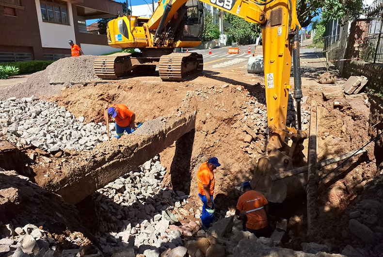 O estrago vinha causando alagamentos na área. O reparo na rede utilizou materiais diversos, como rachão, brita graduada e tubos de concreto de diâmetro variado. O trânsito está interrompido no local até a finalização do serviço. A pavimentação do trecho que recebeu melhorias deverá ser realizada na próxima semana.