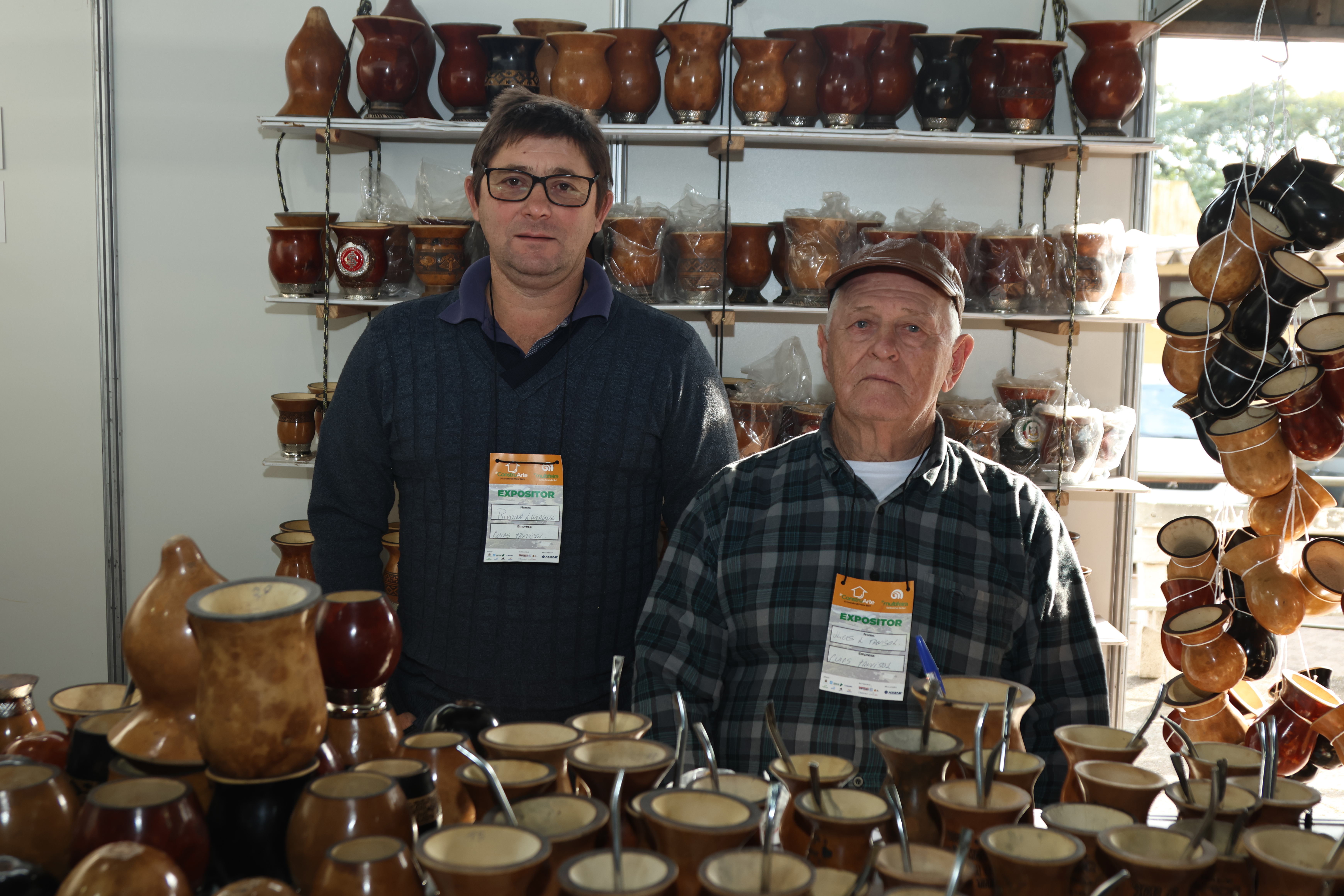 No Pavilhão 3, onde estão expostos itens como vestuário, artesanato e produtos da agroindústria, uma das empresas é a Cuias Artesanais, do município de Frederico Westphalen. As cuias podem ser personalizadas na hora. O proprietário, Ulices Luiz Trevisol, e o sobrinho Rivelino Luis Werlang estão no evento pela segunda vez.