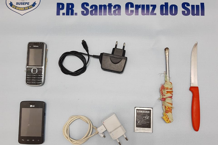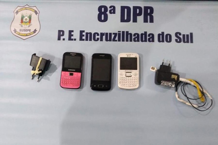 Já no Presídio Estadual de Encruzilhada do Sul, após um alerta do policial militar na guarda externa da casa prisional, os agentes interceptaram o arremesso de um telefone celular. O aparelho apreendido estava dentro de um saco plástico que foi jogado no pátio no horário de banho de sol dos presos. No anexo do semiaberto também foram localizados três telefones celulares e acessórios.