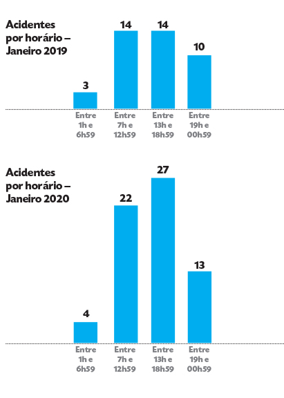 Em outro dado apresentado pelo tenente-coronel, percebe-se que 69% dos acidentes em janeiro deste ano aconteceram em horários de pico, entre as 7 horas e as 18h59. Em janeiro de 2019, dos 41 registros, 28 ocorreram nesse mesmo espaço de tempo – os mesmos 69%. “Isso se deve ao fato de que durante a manhã e a tarde ocorre o maior fluxo de veículos e pedestres nas vias da cidade, tendo em vista os horários de funcionamento dos educandários e do comércio de forma geral”, ressaltou.