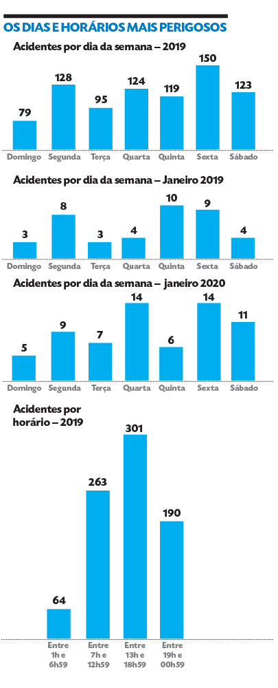 O comandante detalhou que as segundas e sextas-feiras foram os dias da semana em que ocorreram mais acidentes, 128 e 150 casos, respectivamente. Ao traçar um comparativo entre janeiro de 2019 e 2020, Moresco também identificou que os registros têm crescido em mais dias da semana. “Verifica-se uma oscilação entre as quartas, quintas e sextas-feiras.”