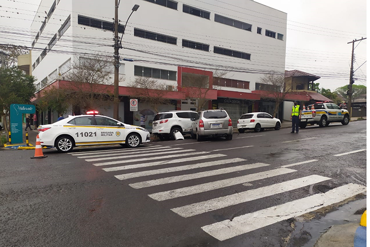 Uma colisão envolvendo quatro veículos foi registrada na manhã desta segunda-feira, 26, no Centro, em Santa Cruz do Sul. O acidente ocorreu por volta das 8 horas, na esquina das ruas Tenente Coronel Brito e Tiradentes. Uma mulher ficou levemente ferida e precisou de atendimento médico.