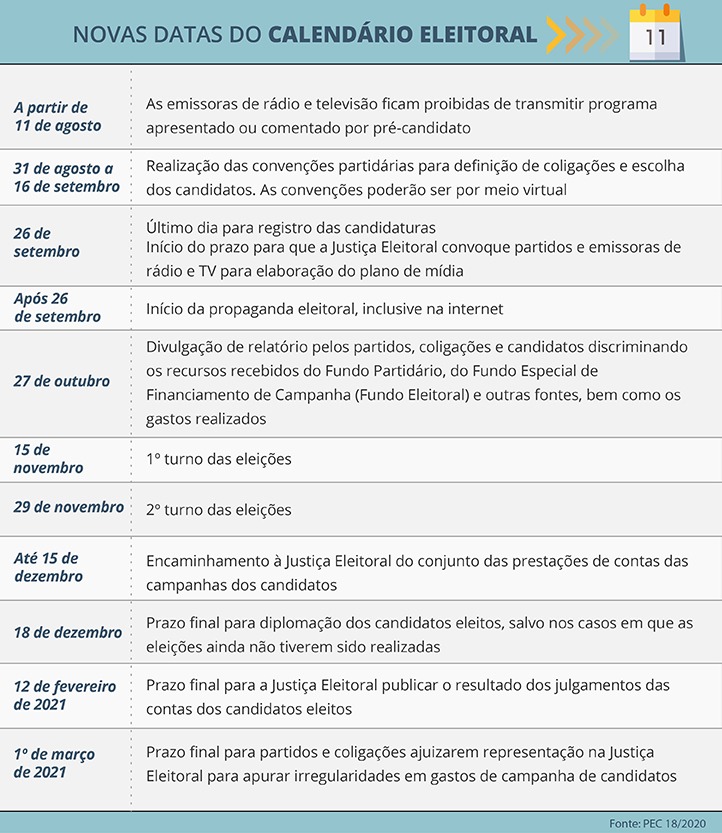 Dessa forma, o primeiro turno das eleições municipais será adiado de 4 de outubro para o dia 15 de novembro. A data do segundo turno passa para o dia 29 de novembro.