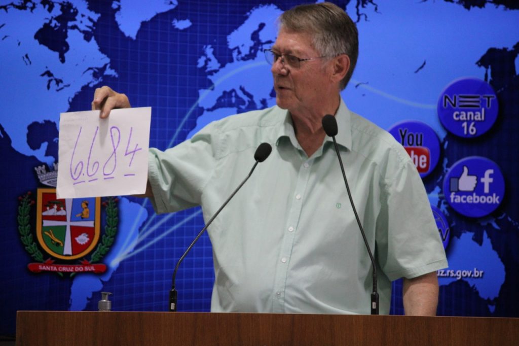 Edmar Hermany (PP), por exemplo, marido da prefeita eleita Helena Hermany (PP), subiu à tribuna com um cartaz no qual destacou o número 6.684 (foto), que corresponde à vantagem de votos em relação ao terceiro colocado.