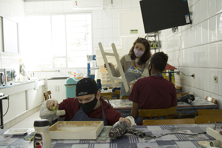 Com três alunos em uma sala e mantendo todos os protocolos, a professora da turma de preparação para o mercado de trabalho, Cristina Petry, diz que os jovens podem ingressar no grupo com 16 anos, mas não há idade para concluírem. “A gente tenta simular uma empresa, com rotina de trabalho. Trabalhamos com eles sobre documentação, autonomia – que é um dos objetivos principais –, higiene e horários”, detalha.