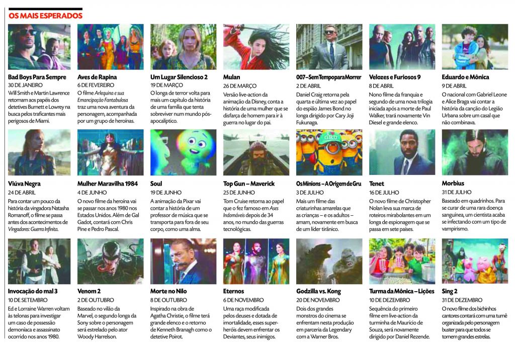Prepare a pipoca! Se o ano passado foi marcado por muitas estreias, 2020 não será diferente. Os fãs de aventura, ação, drama, comédia, animação, terror e filmes nacionais terão muito o que aguardar das telonas no ano que está começando. Dos longas divulgados até agora, já temos muito que esperar, e como tem sido comum nos últimos tempos, boa parte das estreias é baseada em livros, sequências ou remakes. Jogando com a memória afetiva dos espectadores, 2020 será para revisitar alguns longas favoritos que ganham novas roupagens, como Velozes e Furiosos, James Bond, Top Gun, Godzilla e King Kong.
