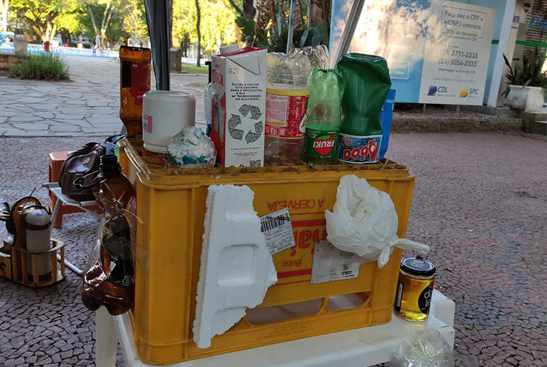 No estande, estão expostos itens que podem ser destinados à reciclagem, como caixas, garrafas PET e de vidro, potes e pedaços de isopor. Uma das coordenadoras da Coomcat, Vera Lúcia Flores da Rosa, ressalta que muitas pessoas não sabem onde deixar os resíduos que produzem. Quando são colocados em contêineres, acabam sendo destinados ao aterro sanitário. “Todo mundo tem que ter essa consciência, não adianta uma ou duas pessoas fazerem a diferença se a maioria não dá bola. Acho que o planeta tá gritando, tá pedindo socorro, então que todo mundo se engaje nessa separação correta”, comenta.