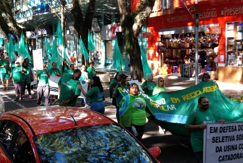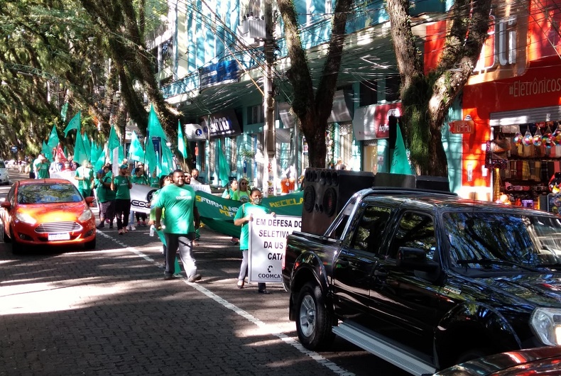 A Cooperativa de Catadores e Recicladores (Coomcat) de Santa Cruz do Sul realiza na manhã desta terça-feira, 22, uma manifestação reivindicando avanços na coleta seletiva solidária. Entre os objetivos da ação está, ainda, o pedido de reforma da usina municipal de resíduos, com a gestão dos próprios catadores. O protesto teve início na Praça Siegfried Heuser e segue com caminhada até o Palacinho.