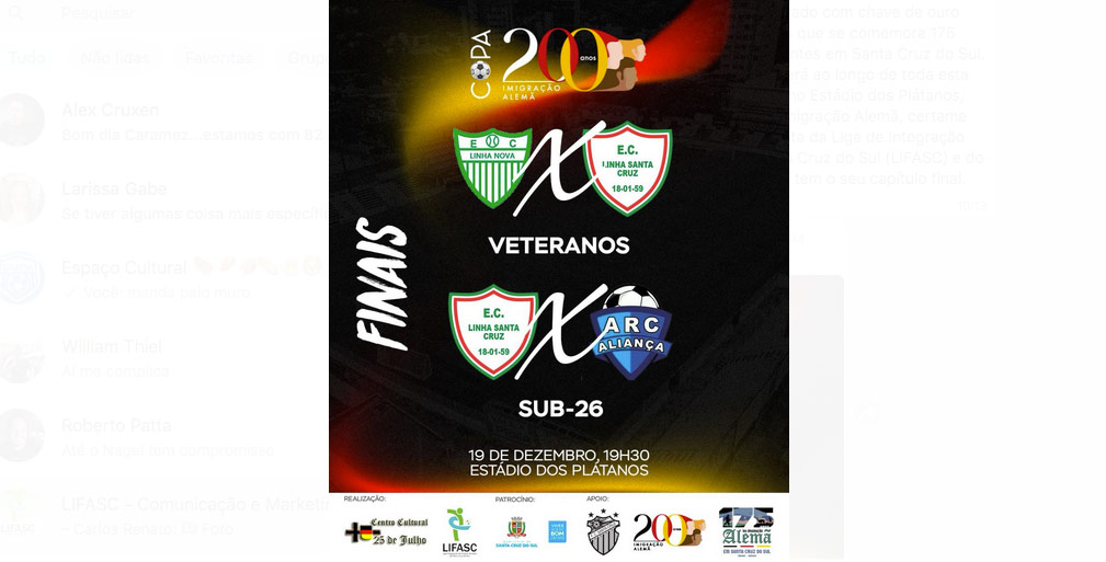 A partir das 19h30, o primeiro grande jogo da noite será entre Linha Nova e Linha Santa Cruz, pela categoria veteranos. Quem vencer no tempo normal garante o título da competição na categoria. E logo após haverá a partida entre Linha Santa Cruz e Aliança, pelo sub-26, valendo o troféu de campeão. A entrada é franca para o público, que pode prestigiar dois grandes jogos e ainda celebrar essa data marcante para a imigração alemã em Santa Cruz do Sul.