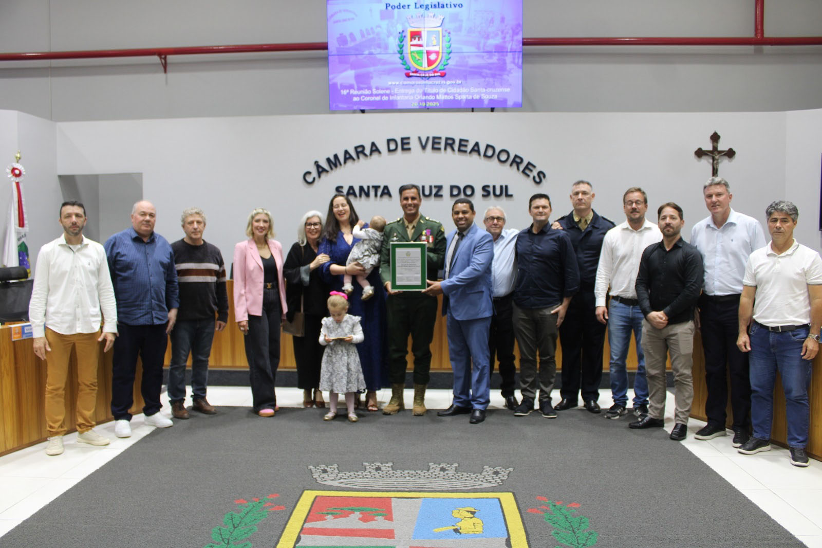 A noite dessa segunda-feira, 20, foi de emoção na Câmara de Vereadores. O comandante do 7º Batalhão de Infantaria Blindado (7º BIB), coronel Orlando Mattos Sparta de Souza, foi homenageado pelo Legislativo com o título de Cidadão Santa-cruzense. A condecoração, proposta pelo vereador Professor Cleber (União Brasil), com a parceria da presidente Nicole Weber Covatti (PP), destaca os dois anos de atuação do militar em Santa Cruz do Sul.