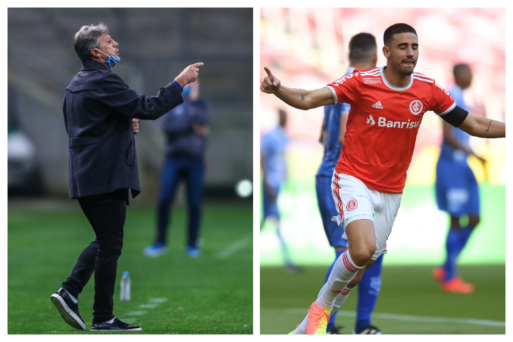 Renato Portaluppi (à esquerda) prevê duelo equilibrado. Thiago Galhardo (direita) foi um dos destaques da goleada do Inter na semi