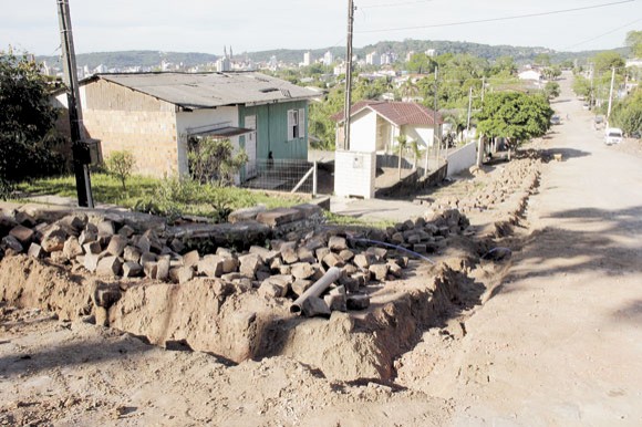 Na Rua Bela Vista, no Bairro Senai, moradores convivem com paralelepípedos revirados, poeira e buracos na via. No local, está sendo substituída a rede de água. Isto é, funcionários da Corsan estão desativando a canalização antiga, que fica no meio da rua, e instalando uma rede nova, junto ao meio-fio. Por isso, há aberturas ao longo de toda a rua. Em alguns pontos, funcionários já se ocupam do restauro do calçamento.
