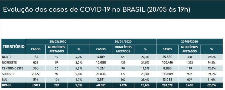 Em relação à penetração da pandemia, as regiões com o maior número de municípios com casos registrados são o Norte (79,6%), Nordeste (74,2%), Sudeste (59,5%), Sul (51%) e Centro-Oeste (42,6%). Em um mês, 2.063 novas cidades notificaram casos confirmados de Covid-19. Outros 2.082 municípios ainda não relataram nenhum caso.