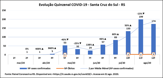 O Observatório do Desenvolvimento Regional (ObservaDR), projeto que compõem o Programa de Pós-Graduação em Desenvolvimento Regional da Unisc divulgou, nessa quarta-feira, 2, novos dados referentes à pandemia em Santa Cruz do Sul. Entre os dias 28 de julho e 28 de agosto, o número de casos do novo coronavírus no município praticamente dobrou, saltando de 358 para 715 confirmados, o que corresponde a uma alta de 99,72%. Além disso, número de óbitos também cresceu, de três para oito no mesmo período. O Centro segue como o bairro que concentra o maior número de pessoas que já tiveram contato com o vírus.