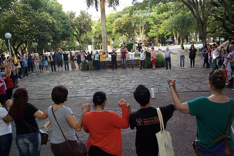A mobilização começou por volta das 17h30 e contou com representantes dos professores, alunos e da direção estadual do Cpers/Sindicato. Durante os discursos, os ânimos se acirraram depois que um homem que passava pela Praça Getúlio Vargas começou a gravar o ato com o telefone celular. Eduardo Wartchow, que disse ser pai de alunos da rede estadual, afirmou à reportagem que estava passando e decidiu gravar o ato. Participantes da mobilização hostilizaram Wartchow, que seguiu no local até o fim do encontro.