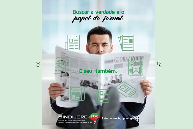 O Sindicato das Empresas Proprietárias de Jornais e Revistas do Rio Grande do Sul (Sindijore-RS), entidade que reúne as principais publicações do Estado, lança hoje uma campanha publicitária de valorização do jornal. Com o conceito Buscar a verdade é o papel do jornal. E o seu, também, as peças reforçam a credibilidade dos jornais no combate às notícias falsas (fake news) e salientam a sua capacidade de apresentação em múltiplas plataformas.