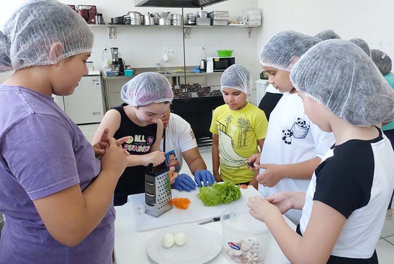 Filho de mãe confeiteira, Murilo Luís dos Santos, 9 anos, não é principiante na cozinha e volta e meia ajuda a mãe no preparo de alguma iguaria. Na hora das refeições, muito ingrediente saudável no prato. “Geralmente como arroz, feijão, batata e gosto de brócolis, alface, couve-flor”, disse. Questionado sobre se estava gostando da atividade, ele não se intimidou e respondeu com sinceridade. “Estou gostando muito porque no final vou comer”, brincou.
