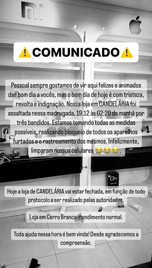 Foi solicitada no local a presença do Instituto-Geral de Perícias (IGP). O proprietário da loja irá fazer o levantamento dos itens levados e o total prejuízo. Em postagem no Instagram, a On Digital afirmou que estaria fechada nesta terça-feira. “Estamos tomando as medidas cabíveis e realizando o bloqueio de todos os aparelhos furtados e rastreamento dos mesmos”, relatou a empresa na rede social. O caso será investigado pela Polícia Civil.