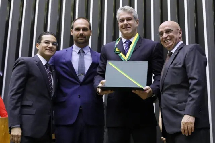 Gustavo Corrêa, cunhado da apresentadora Ana Hickmann, recebeu nesta quarta-feira, 20, a Medalha Mérito Legislativo na Câmara dos Deputados, em Brasília. O empresário agradeceu no Instagram pela homenagem: “Obrigado pela indicação aos deputados Eduardo Bolsonaro e Carlos Jordy”.