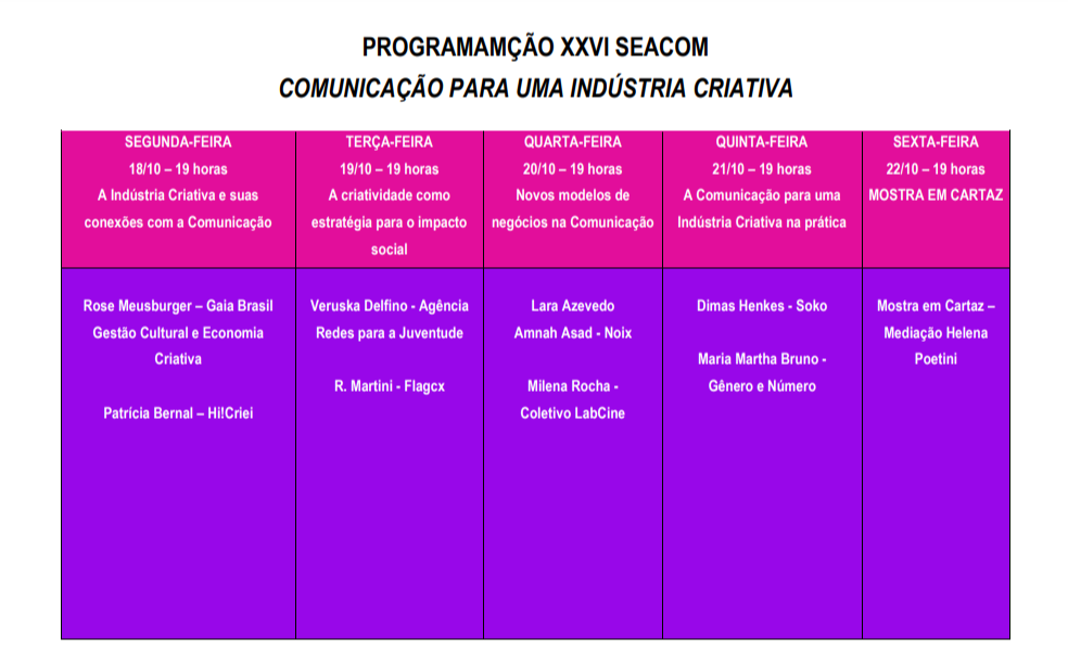 A programação completa, que inicia sempre às 19 horas, vai abarcar nomes das distintas áreas da Comunicação, a exemplo de Jornalismo, Publicidade e Propaganda, Relações Públicas, Produção em Mídia e Audiovisual e Fotografia. Mais informações estão disponíveis nas redes sociais do curso.